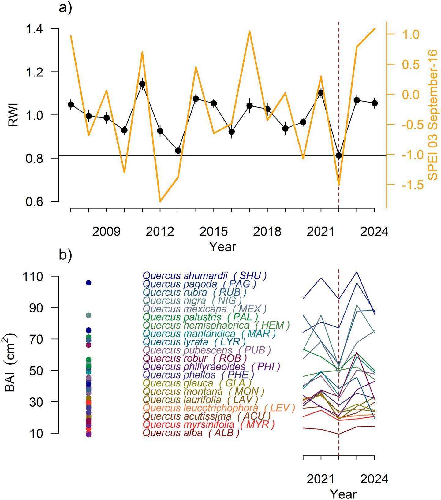 Mean series of (a) oak ring-width indices (RWI) (black lines with symbols) as related to the 3-month SPEI calculated for mid-September (right y axis, yellow line). (b) Data of basal area increment (BAI) considering individual values (points) or means for species (lines) calculated for the period 2020–2024. The dashed line indicates the 2022 drought.