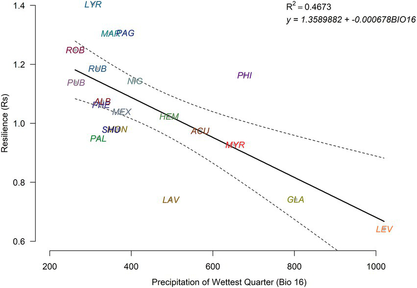 In a biogeographically diverse species set, traits are shaped by climate-of-origin through macro-climatic filtering and adaptation, and traits in turn may contribute to drought resilience (Ramírez-Valiente et al., 2020, 2022). For instance, tree species displaying high recovery to extreme drought episodes tended to present higher wood density (Serra-Maluquer et al., 2022). A greater use of resources and higher growth rates would be expected in productive wet biomes, whereas a more conservative use and lower growth rates should prevail in drier biomes according to the fast-slow plant economics spectrum (Reich, 2014). In this context, common gardens or arboreta provide ideal settings to disentangle the relative roles played by climate conditions on traits and how traits impact drought resilience by limiting the confounding influences of environmental and phenotypic variation (e.g., Schwinning et al., 2022; Pan et al., 2025; Perez-Martinez et al., 2025).
