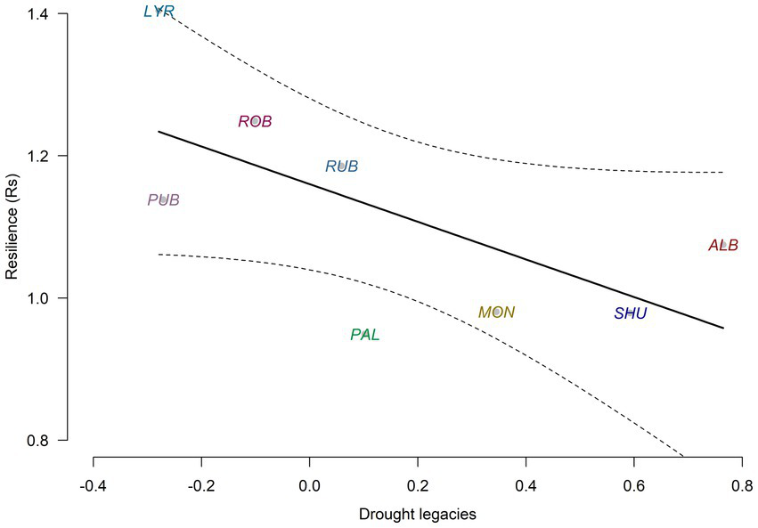 Future forest productivity and resilience would depend on how compound drought and heatwave events reduce tree growth rates and increase the mortality risk (Camarero et al., 2015). Post-drought growth recovery may be also hampered by these extreme climate events, particularly in species showing a low resilience or capacity to restore growth rates after the drought event has finished (Gazol et al., 2018). For instance, deciduous oaks from mesic sites showed a more rapid recovery after drought across the northern Hemisphere, being more resistant to the negative influence of water shortage, and exhibited smaller drought legacies than did evergreen pines from dry sites (Anderegg et al., 2015). In these oaks, drought legacies were more prolonged in dry than in mesic sites, highlighting species-specific responses related to the climate of origin (Fontes et al., 2022; Bose et al., 2024).