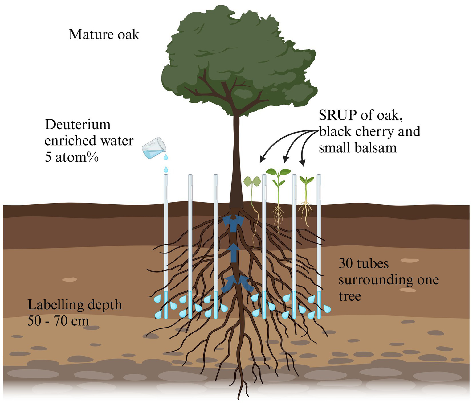 Schematic figure of the experimental setup of labeling experiment. A total of five mature oaks with surrounding shallow rooted understory plants (SRUP) of oak, black cherry and small balsam were selected. Within a radius of 1.5 m surrounding the mature tree, 30 perforated PVC-tubes were equally distributed in a circle. 21 days after the tubes were installed, a total of 7.2 L of 2H labeled water per tree was inserted through the tubes to a soil depth of 50–70 cm, well below the maximum rooting depth of the SRUP. Six and 60 days after the labeling, soil samples and SRUP roots were sampled, and analyzed for δ2H enrichment due to HR by the mature tree. Created in Biorender (https://BioRender.com/n87t455).