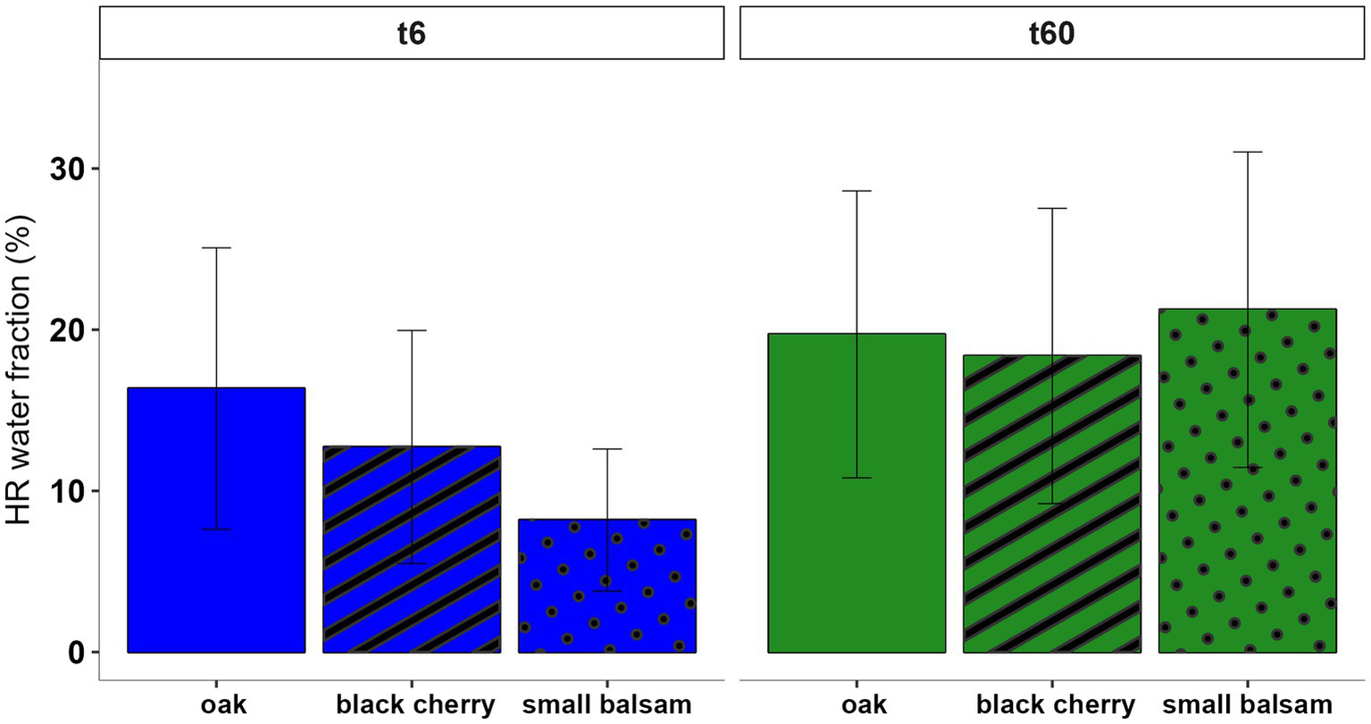 HR water in SRUP root water by species (bars with no pattern = oak, bars with stripe pattern = black cherry and bars with dotted pattern = small balsam) at t6 (blue bar) and t60 (green bar). Values represent mean ± 1SE. No significant differences were found between the species at either t6 or t60.