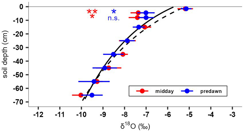 δ18O values by soil depth at midday (red) and predawn (blue) ± 1 SE in diurnal experiment. The solid black line represents an exponential fit of the δ18O soil profile using all values, while the dashed black line represents the fit excluding values at 4.5 and 8 cm depth. Red and blue asterisks indicate significant differences between measured values in 4.5 and 8 cm depth from the calculated theoretical soil δ18O value on the dashed line (**p < 0.01, *p < 0.05, n.s. p ≥ 0.05).