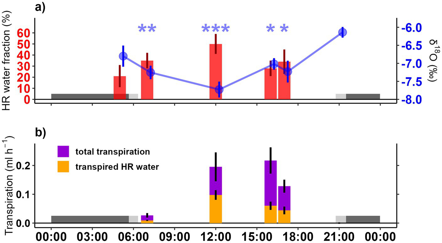 (a) Fraction of HR water (red bars) and δ18O values (blue dots and line) in root water during the diurnal cycle. Fraction of HR water was calculated based on the δ18O values at sunset (Equation 3). Asterisks indicate significant differences in δ18O-values between sunset and the other sampling times (***p < 0.001, **p < 0.01, and *p < 0.05). Bars and dots are slightly shifted along the x-axis to avoid overlapping SE values and improve visibility. (b) Transpiration rates (ml h−1; purple bars) and the corresponding fraction of transpired HR water (orange bars) at the different sampling times. All values are presented as mean ± 1 SE. Dark gray shaded area indicates nighttime, while light gray shaded area indicates dusk and dawn in both panels. Note that sunset (21:00) and early afternoon (16:00) samples were taken 1 day before the others. Since no significant differences were found between the two afternoon samples and weather conditions remained constant across both days, all samples were merged into a diurnal cycle starting from predawn to sunset.