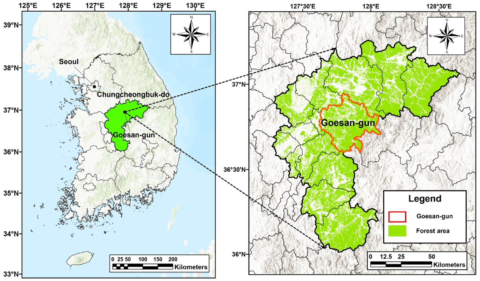 Location and forest cover of the study area, Goesan-gun, a district of Chungcheongbuk-do of South Korea.