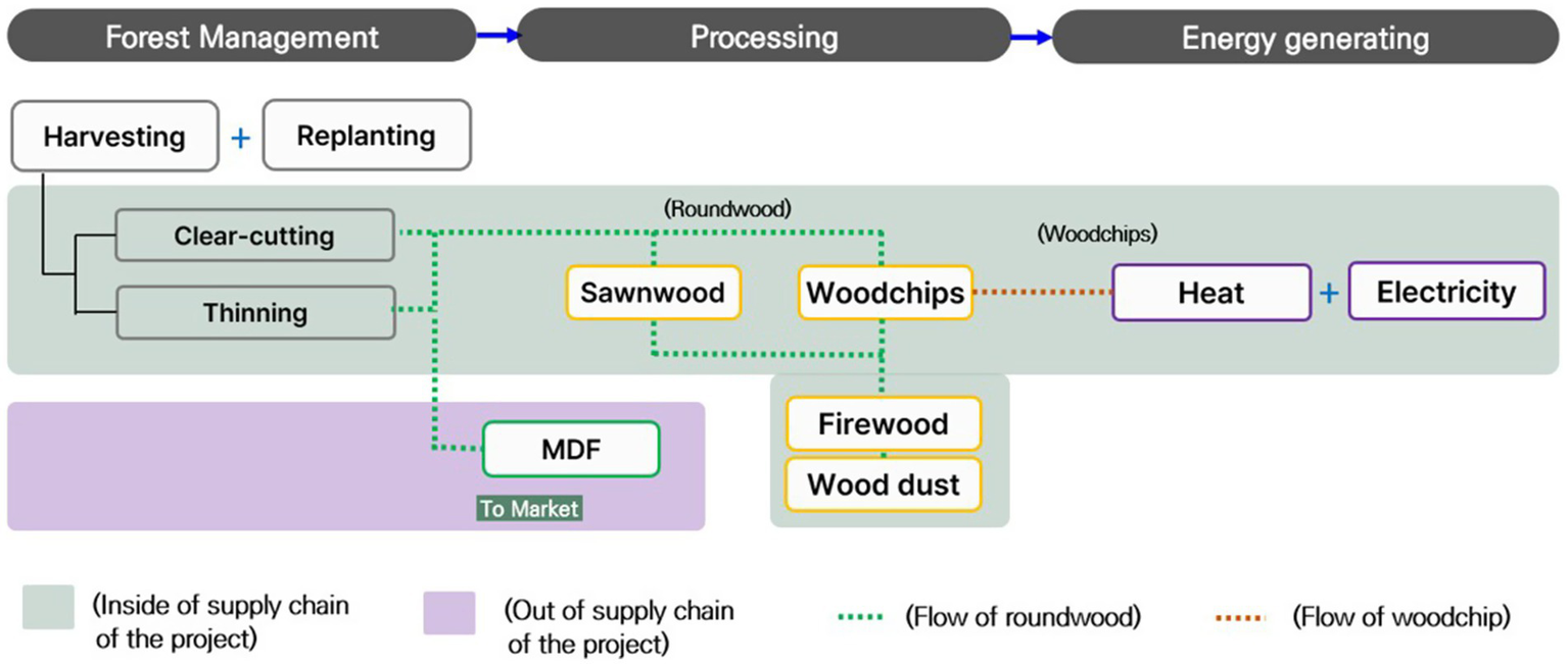 In 2022, the Korea Forestry Promotion Institute and Goesan-gun signed an agreement to advance sustainable forest management and subsequently established a working group comprising asset managers, local forest managers, and a forest biomass company. The objective was to develop a regional-scale best practice for forest management. In 2023, the working group designed an integrated forest supply-chain model spanning forestry operations, wood processing, and biomass energy utilization (the project) and has since been implementing it in a stepwise manner (Figure 3; Korea Forestry Promotion Institute, 2024).