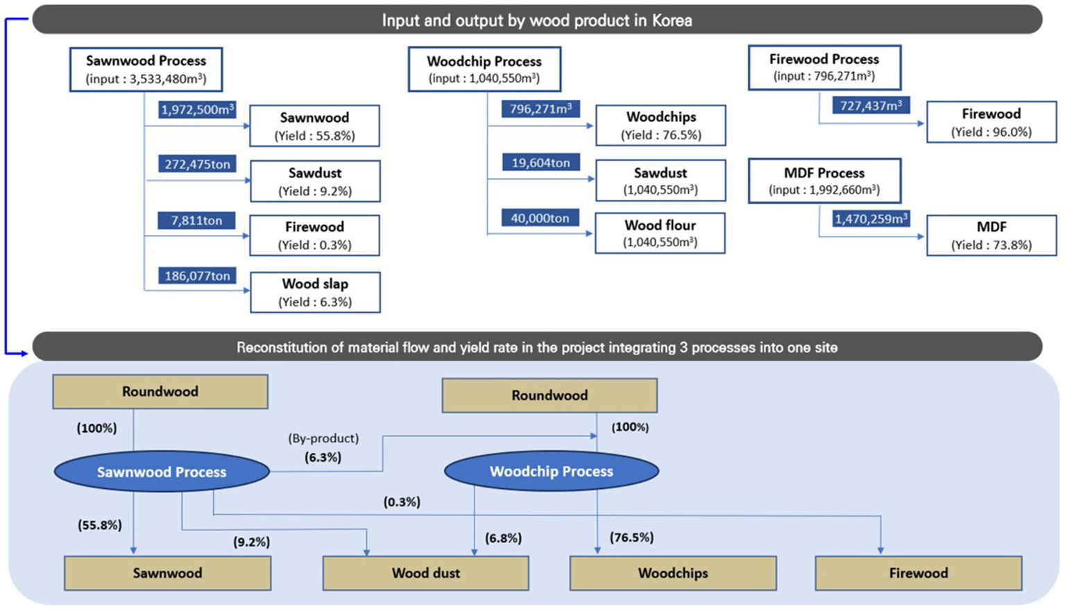 For roundwood production, volumes were calculated separately by area according to harvest methods—clear-cutting or thinning—using national statistics for the South Korean wood industry (Korea Forest Service, 2023b). The harvested roundwood was then allocated to the three product types: woodchips for energy, sawnwood, and other biomass for medium-density fiberboard (MDF), which were selected in the project to maximize mitigation effects through fossil fuel substitution and carbon storage in HWPs (Figure 5). Input volumes for these three commodities were determined by reclassifying 15 categories from the national statistics on roundwood production and utilization into the corresponding four commodities (Supplementary Figure S3; Korea Forest Service, 2023b). Final products at the processing stage were estimated by multiplying the roundwood volume by the average yield rate of wood processing, based on national statistics for the South Korean wood industry (Figure 6; Korea Forest Service, 2023b). Among wood products, sawnwood and other biomass for MDF were classified as long-lived wood products, storing carbon over extended periods (Gregor et al., 2024).