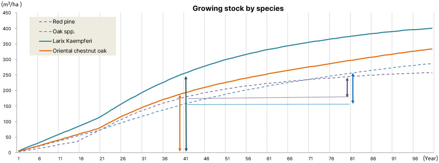 To predict NPP over the 40-year project period, this study estimated and compared the age-class composition and growing stock of forests under the three scenarios, accounting for harvest removals (thinning and clear-cutting) and subsequent regrowth through regeneration. Volume growth was estimated using the “Table of growing stock, biomass and harvest” developed by the National Institute of Forest Science, which provides national-level average growth rates by species and age for forests in South Korea (National Institute of Forest Science, 2014).