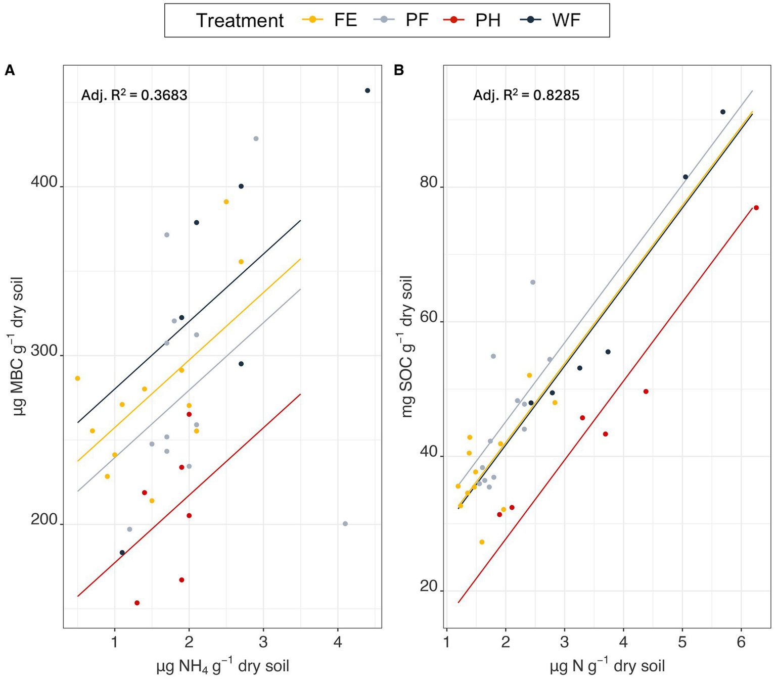 Linear model of soil MBC levels in response to NH4 with watershed treatment as an additive predictor (A), and SOC levels in response to TN with watershed as an additive predictor (B). Original sample data was overlayed on predictions as points.
