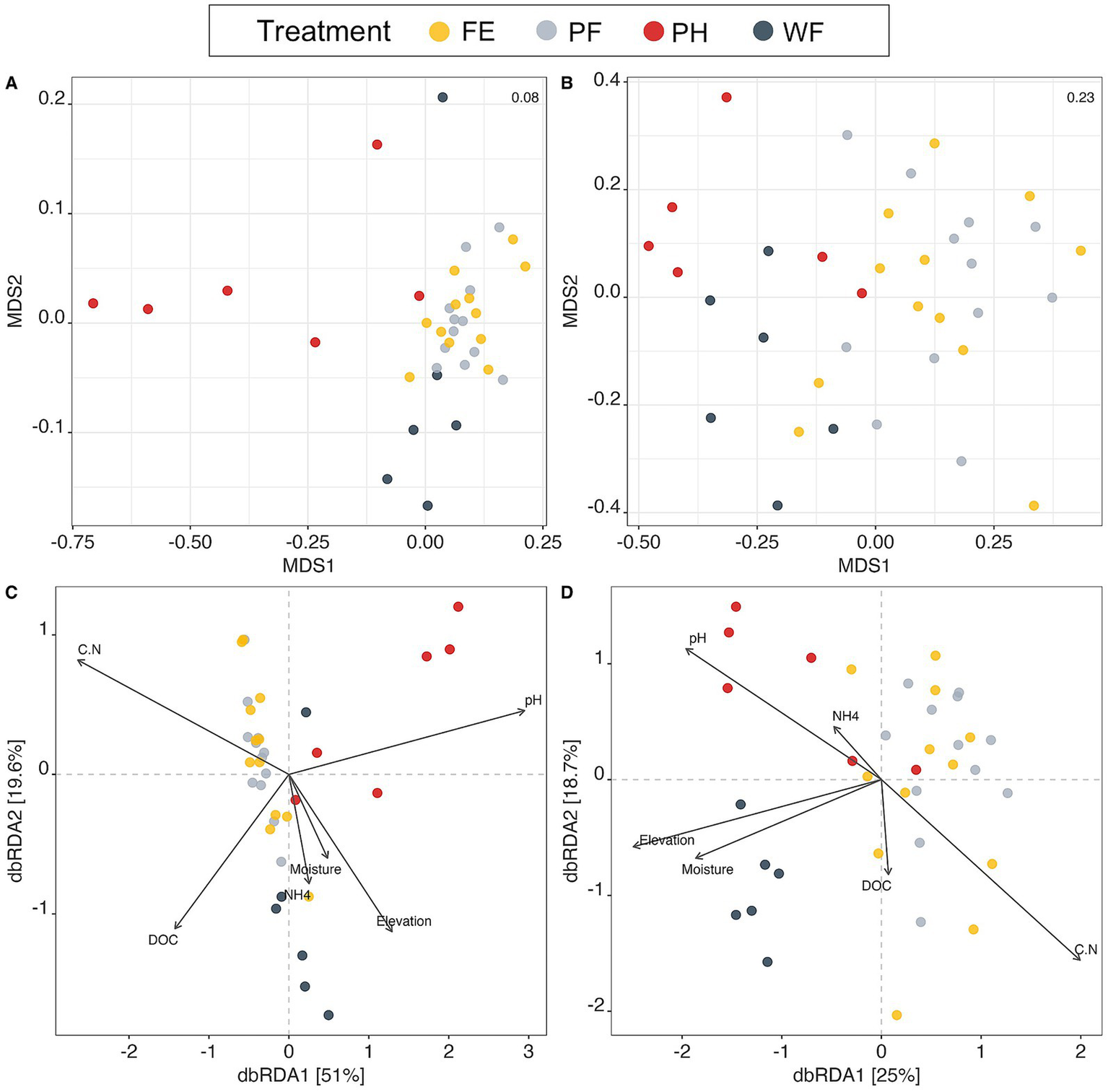 Non-metric multidimensional scaling (NMDS) and distance-based redundancy analysis (dbRDA) using Bray-Curtis distances of both bacterial communities using 16S ASVs (A,B) and fungal communities using ITS ASVs (C,D) on watershed treatments (prescribed fire; PF, fire excluded; FE, wildfire; WF, partial harvested; PH). PERMANOVA on Bray-Curtis distances between watersheds determined that all watershed communities were significantly different from one another (p ≤ 0.003) except for PF and FE bacterial (p = 0.5350; A) and fungal (p = 0.7430; B) communities. 44.7% (C) and 22.2% (D) of community variance is constrained by environmental variables in dbRDA plots. Significant predictors of bacterial communities include moisture, pH, NO3−, elevation, and C: N (C) and pH and moisture for fungal communities (D); see Supplementary Tables S5, S6 for statistical results. Environmental variables for analysis were selected to reduce collinearity.