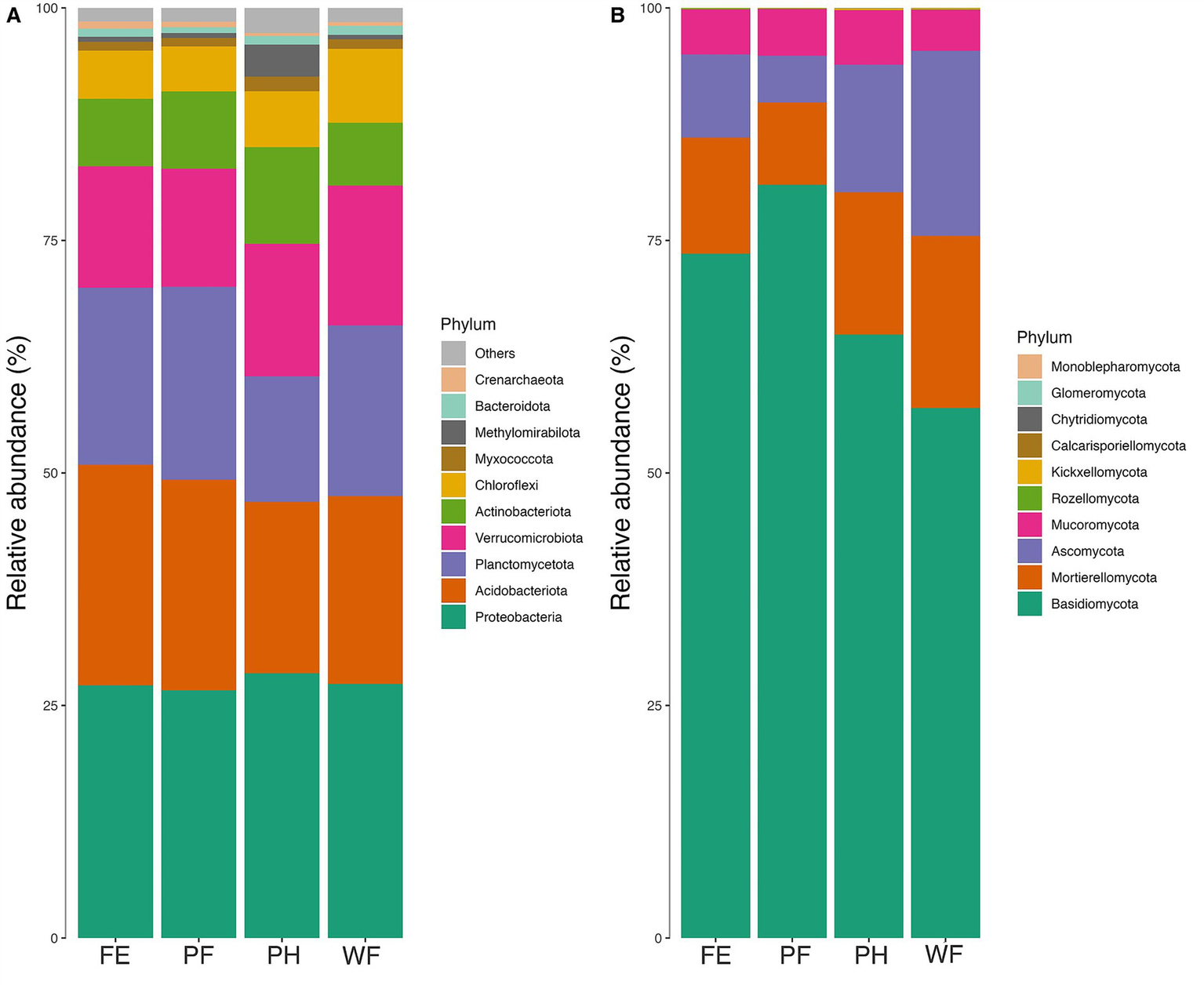 Mean relative abundance of the top ten bacterial phyla (A) and fungal phyla (B) in mineral soil samples across watershed treatments (prescribed fire; PF, fire excluded; FE, wildfire; WF, partial harvested; PH). Significant differences between phyla in across watersheds can be found in Supplementary Table S7.