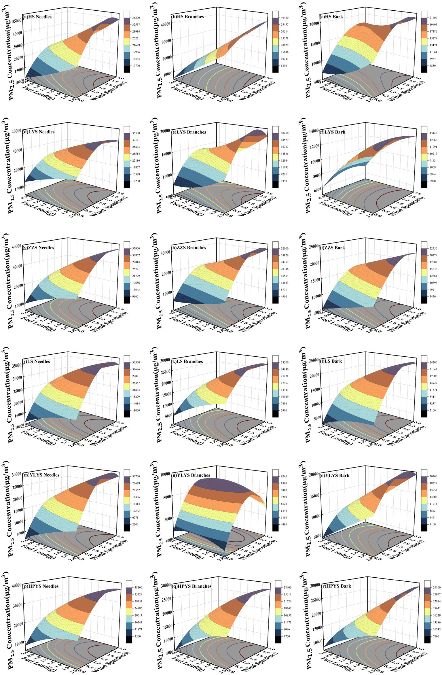 The PM2.5 concentration under the interactive effects of fuel load and wind speed with a moisture content of 0%. (a) HS needles, (b) HS branches, (c) HS bark, (d) LYS needles, (e) LYS branches, (f) LYS bark, (g) ZZS needles, (h) ZZS branches, (i) ZZS bark, (j) LS needles, (k) LS branches, (l) LS bark, (m) YLYS needles, (n) YLYS branches, (o) YLYS bark, (p) HPYS needles, (q) HPYS branches, (r) HPYS bark.