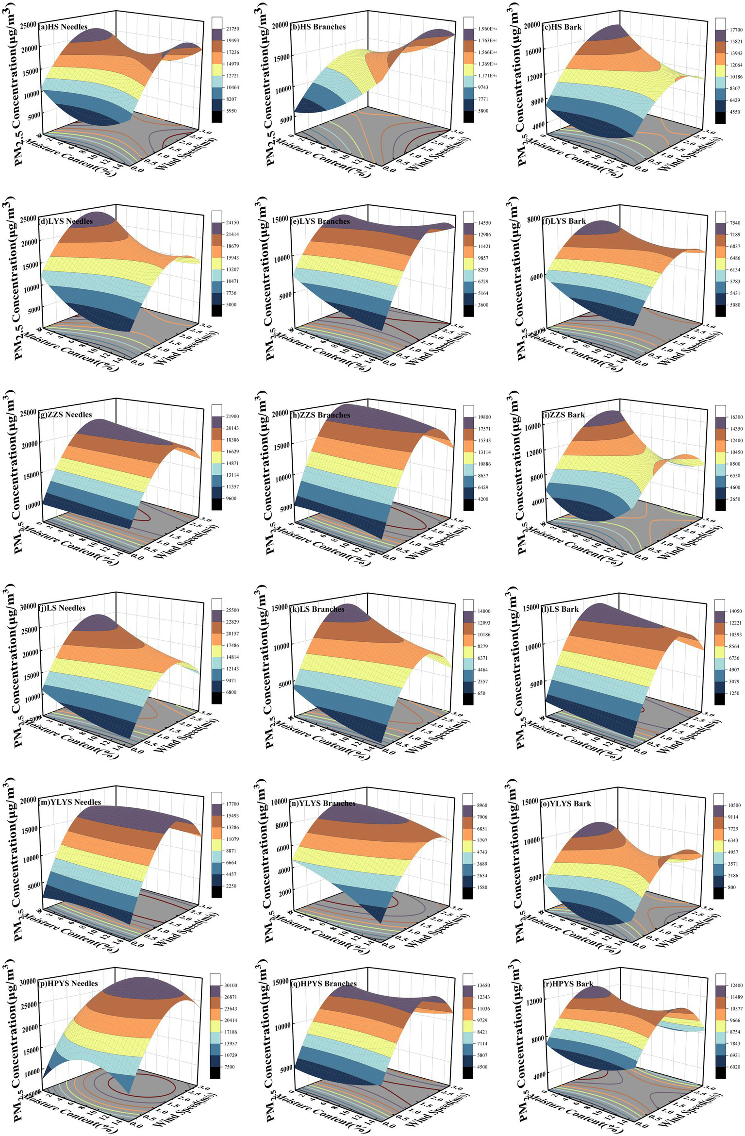 The PM2.5 concentration under the interactive effects of moisture content and wind speed at 0.5 g fuel load. (a) HS needles, (b) HS branches, (c) HS bark, (d) LYS needles, (e) LYS branches, (f) LYS bark, (g) ZZS needles, (h) ZZS branches, (i) ZZS bark, (j) LS needles, (k) LS branches, (l) LS bark, (m) YLYS needles, (n) YLYS branches, (o) YLYS bark, (p) HPYS needles, (q) HPYS branches, (r) HPYS bark.