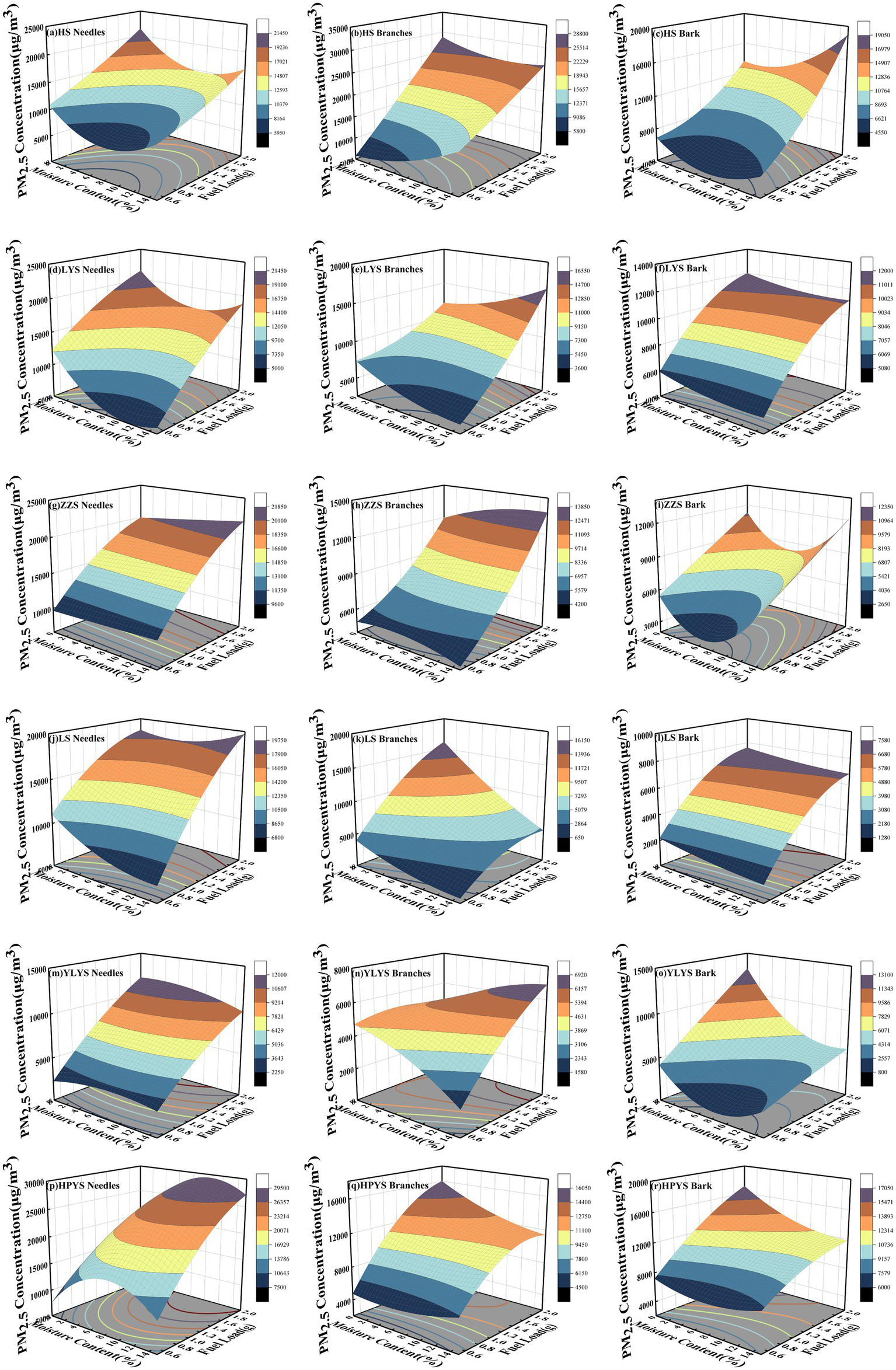 The PM2.5 concentration under the interactive effects of moisture content and fuel load with wind speed at 0 m/s. (a) HS needles, (b) HS branches, (c) HS bark, (d) LYS needles, (e) LYS branches, (f) LYS bark, (g) ZZS needles, (h) ZZS branches, (i) ZZS bark, (j) LS needles, (k) LS branches, (l) LS bark, (m) YLYS needles, (n) YLYS branches, (o) YLYS bark, (p) HPYS needles, (q) HPYS branches, (r) HPYS bark.