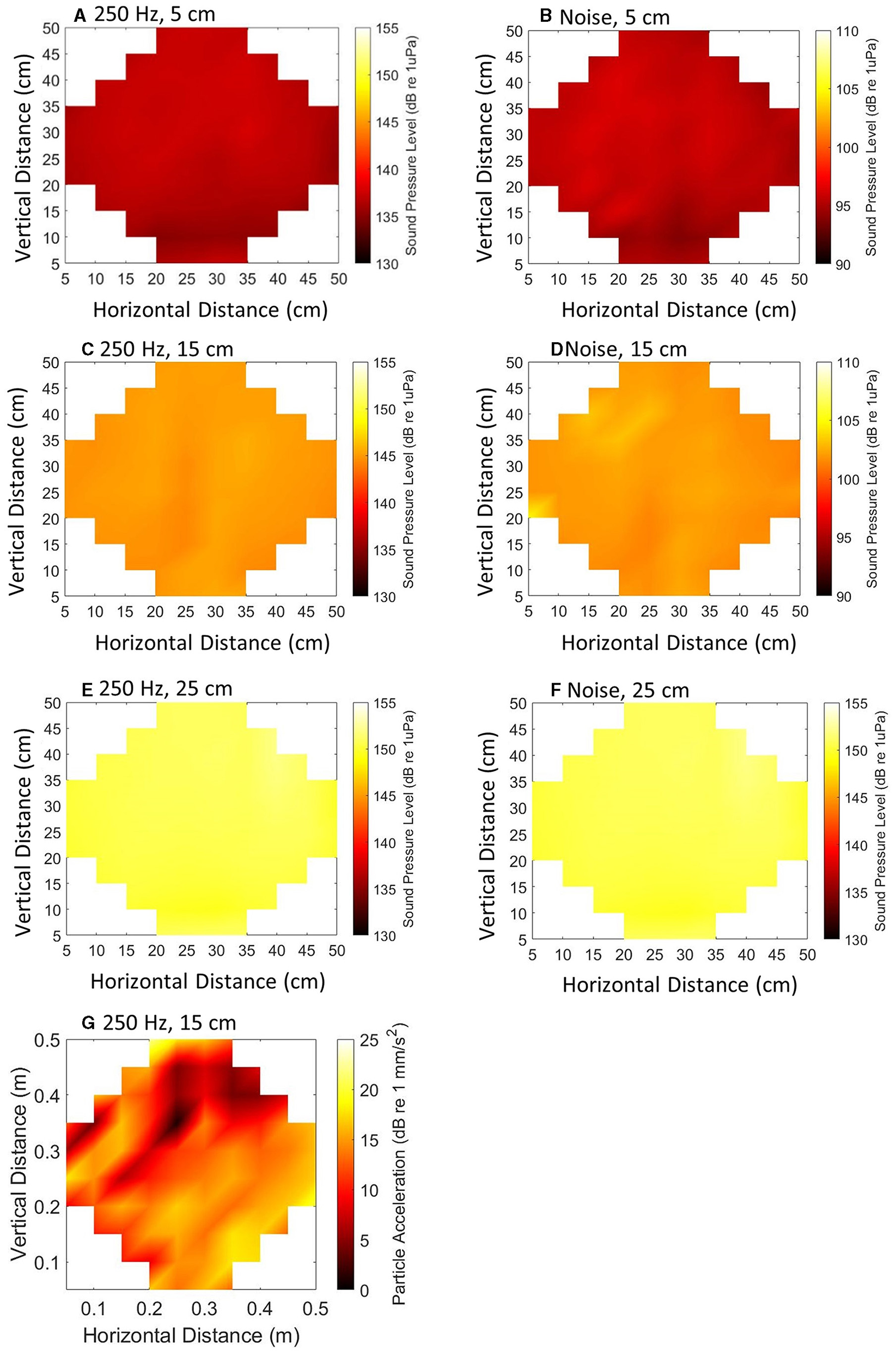 Maps illustrating Sound Pressure Level (SPL) (A–F) and Particle Acceleration (PA) (G) of a 120 ms, 250 Hz stimulus (A, C, E, G) at 145 dB re 1 μPa in the center of the arena and 100–2500 Hz band-limited random noise (B, D, F) at 110 dB re 1 μPa in the center of the arena. Point measurements were taken at three depths (5, 15, and 25 cm measured from the water surface).