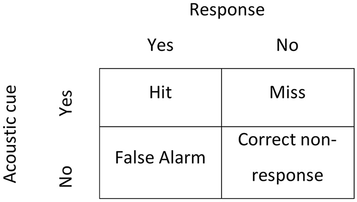 Four potential outcomes considered in Signal Detection Theory. In this study, the acoustic cue was either identified (yes) or not (no) in a 4 min control period in presence or absence of noise. The response was the presence (yes) or absence (no) of a startle response.
