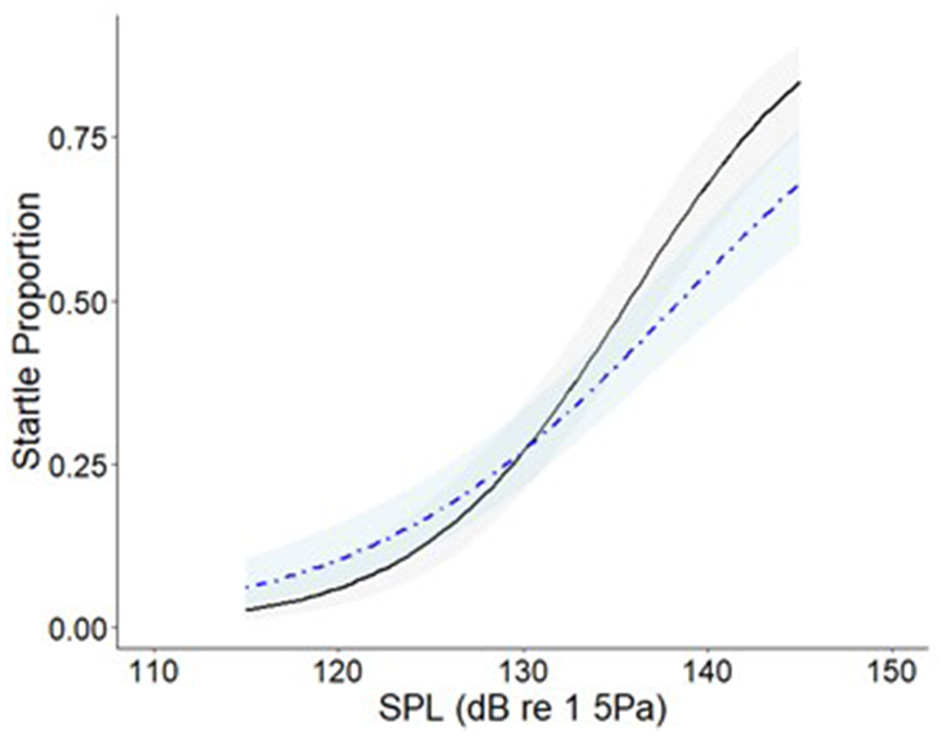 There was no difference in the proportion of the tested population exhibiting startle responses between the ambient control and the noise treatment (z = 0.996, p = 0.319). However, on visual inspection of the dose-response curves (Figure 4), a larger proportion of the population startled in the quiet compared to the noisy condition when the SPL of the signal was 115 dB re 1 μPa and 125 re 1 μPa. Conversely, when the signal was 135 dB re 1 μPa and 145 dB re 1 μPa, a larger proportion of startles occurred in the noisy treatment compared to the ambient control.