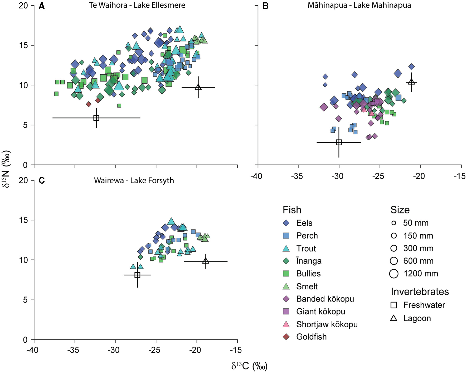 Figure 1. Isotopic biplots of overall fish communities found in the tributaries of (A) Te Waihora, (B) Māhinapua, and (C) Wairewa. All fish were separated into common predatory species (blue hues), common prey species (green hues) and species found in only one lake catchment (red hues), with species/taxa distinguished by shape. Point size reflects the total length of individual fish. Invertebrates collected from freshwater (open triangle) and lagoon (open square) environments are depicted as mean ± standard deviation.