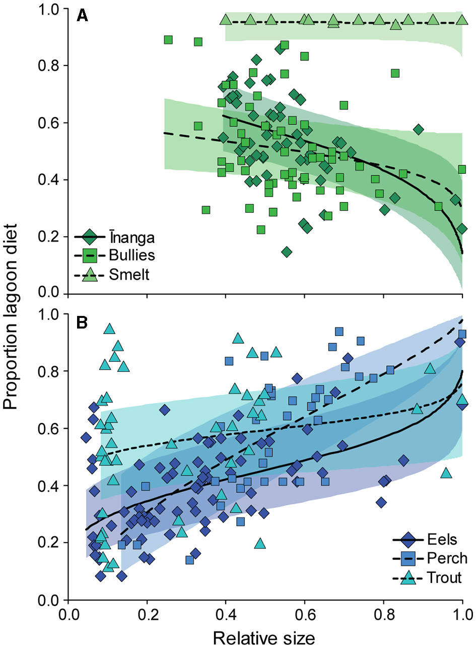 Figure 2. Changes in diet proportions with increasing body size for (A) prey fish and (B) predatory fish. Each point represents an individual fish. Model fits (solid line) and 95% confidence intervals (shaded area) for each species were extracted from the respective linear mixed-effect model with “tributary” included as the random effect.