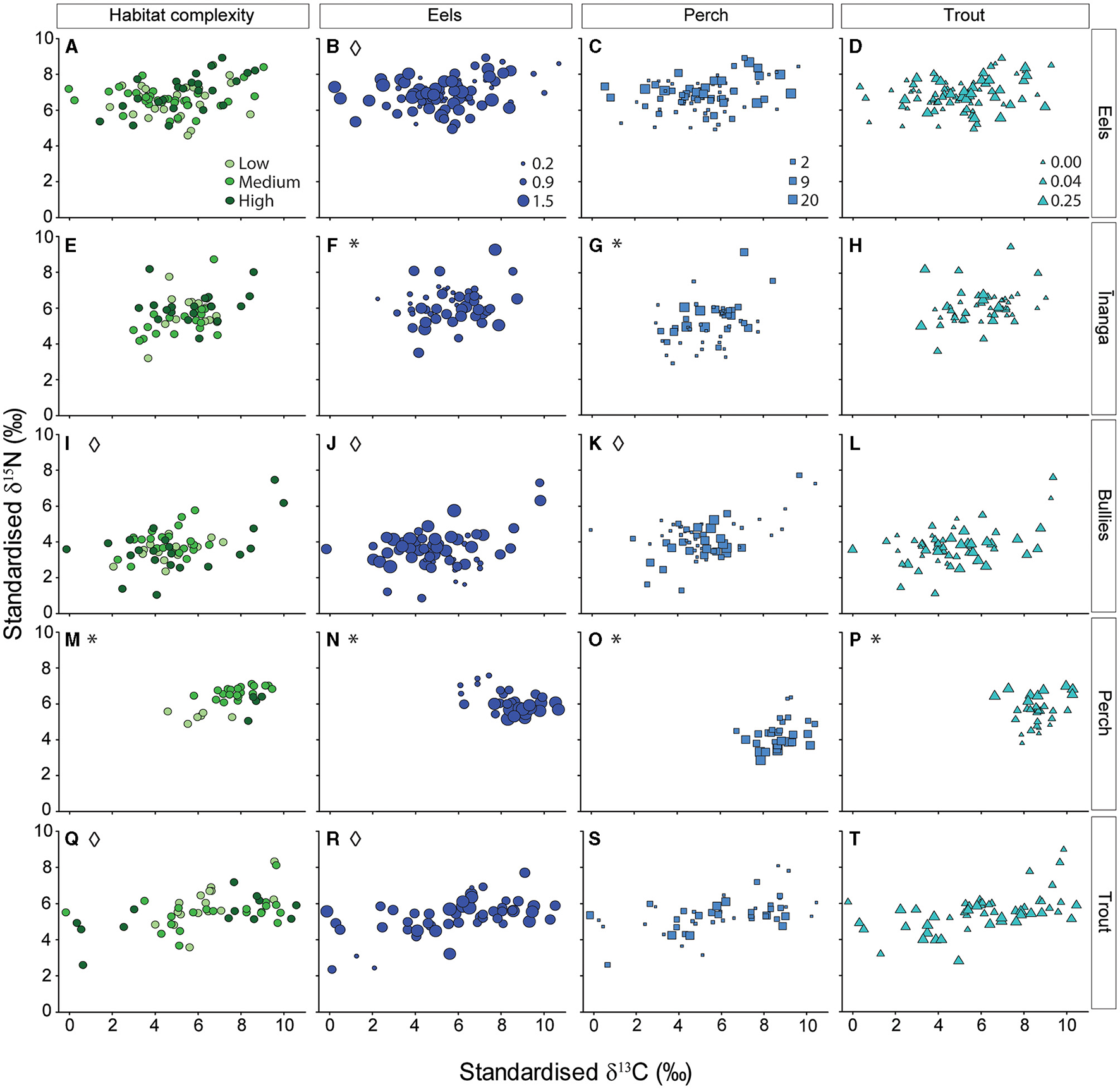 Figure 4. Independent effects of habitat complexity (green) and abundance of three different predatory fish (blue) on the isotopic signatures (δ15N and δ13C) of (A–D) eels, (E–H) īinanga, (I–L) bullies, (M–P) perch, and (Q–T) trout. Individual predictors are organized by columns, and taxon-specific responses are organized by row. Each point reflects the size-adjusted partial model fits taken from a linear mixed effect model that included all four environmental gradients as predictors, with “tributary” included as a random effect. Panels with significant changes in isotopic signatures (i.e., permutational multivariate analysis of variance) are marked with an asterisk (*), and panels with significant changes in isotopic variability (i.e., permutational dispersion tests) are marked with a diamond (♢). For habitat complexity, a lighter color reflects a lower level of complexity (more information available in Supplementary Tables S1, S2). For the three predatory fish, point size reflects local densities for eels and trout (fish per m2), and relative abundance for perch (fish per fyke net).