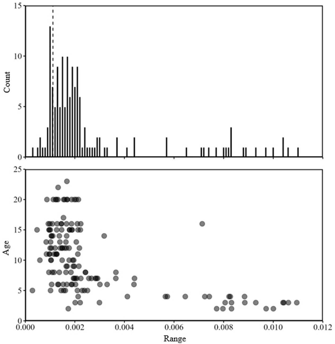 Frequency plot of the range (maximum minus minimum) of 87Sr:86Sr values from each line scan of White Sturgeon fin rays (n = 162) collected in 2015 from the Kootenai River (top panel). The vertical dashed line is the greatest estimated difference between Kootenai River and Kootenay Lake from water samples. Range of 87Sr:86Sr values from each line scan plotted by fish age (in yrs) at capture (bottom panel).