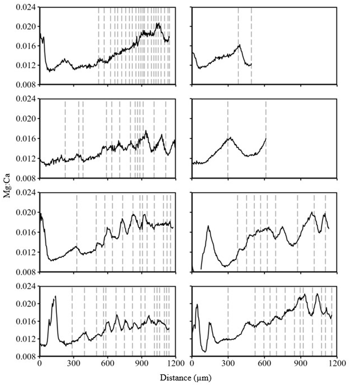Trace element line scan of eight White Sturgeon fin rays collected from the Kootenai River basin in 2015. Black lines represent Mg:Ca values. Vertical dashed lines are annuli. Distance was measured as micrometers of the line scan from the lumen to the edge of the fin ray.