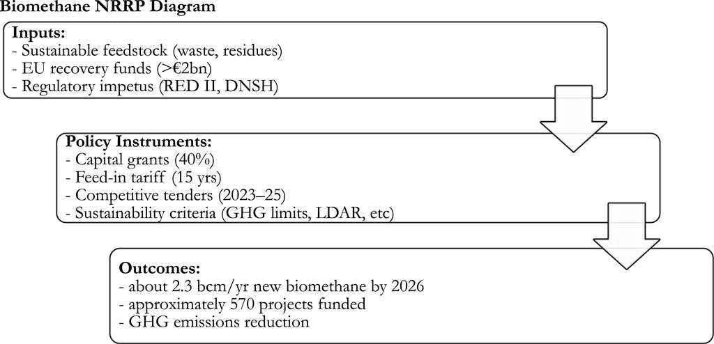 Beyond focusing on the end product (biomethane), the policy encourages upstream and downstream best practices in agriculture and waste management. For example, projects must implement low emission digestate management (e.g., covered slurry storage) and leak mitigation measures. These requirements, embedded in the 2022 Ministerial Decree (Italian Ministry of the Environment and Energy Security, 2022), mean that developers need to incorporate Leak Detection and Repair (LDAR) programs and gas capture systems for their plants. Such provisions ensure environmental integrity across the value chain. In sum, by addressing feedstock sourcing, farming practices, and emissions controls, the NRRP biomethane measure creates synergies between the energy, agriculture, and waste sectors while upholding stringent sustainability standards (Figure 1).