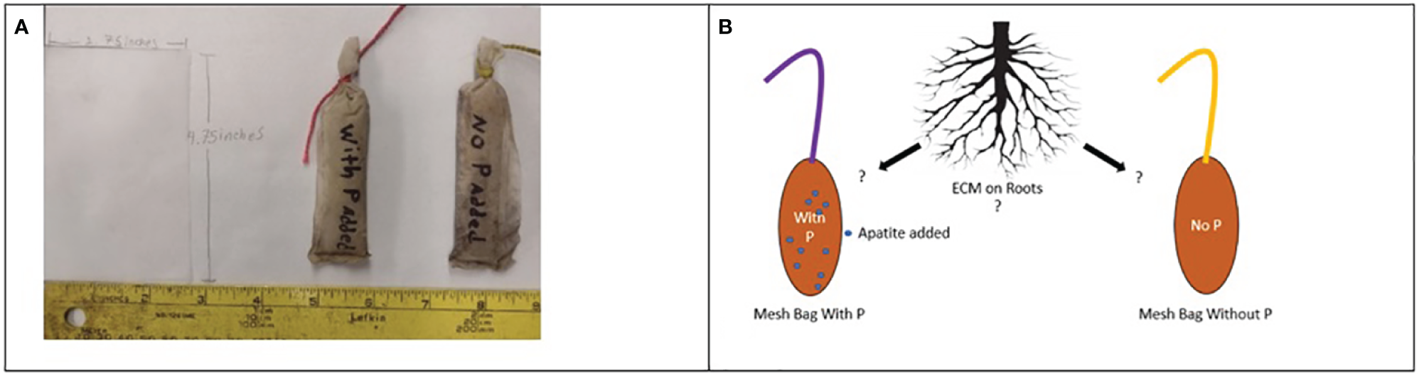 Figure 1 Single sheets of 50 um nylon mesh were cut out and folded to create a bag, then sealed via melting (A). Bags were individually labeled and equipped with two colors of nylon twine to assist in relocating and differentiating between treated and untreated bags. (B) Hypothesis: ECM on the roots scavenging for P will accumulate in bags baited with P and not in bags without P.