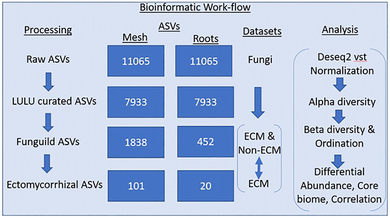 Figure 2 The processing column shows the removal of erroneous amplicon sequence variants (ASVs) performed using LULU, and the functional assignment was performed using Funguild. Two Funguild datasets were created: an ECM and non-ECM dataset and an ECM-only dataset. An individual analysis of each dataset can be found in the analysis column.