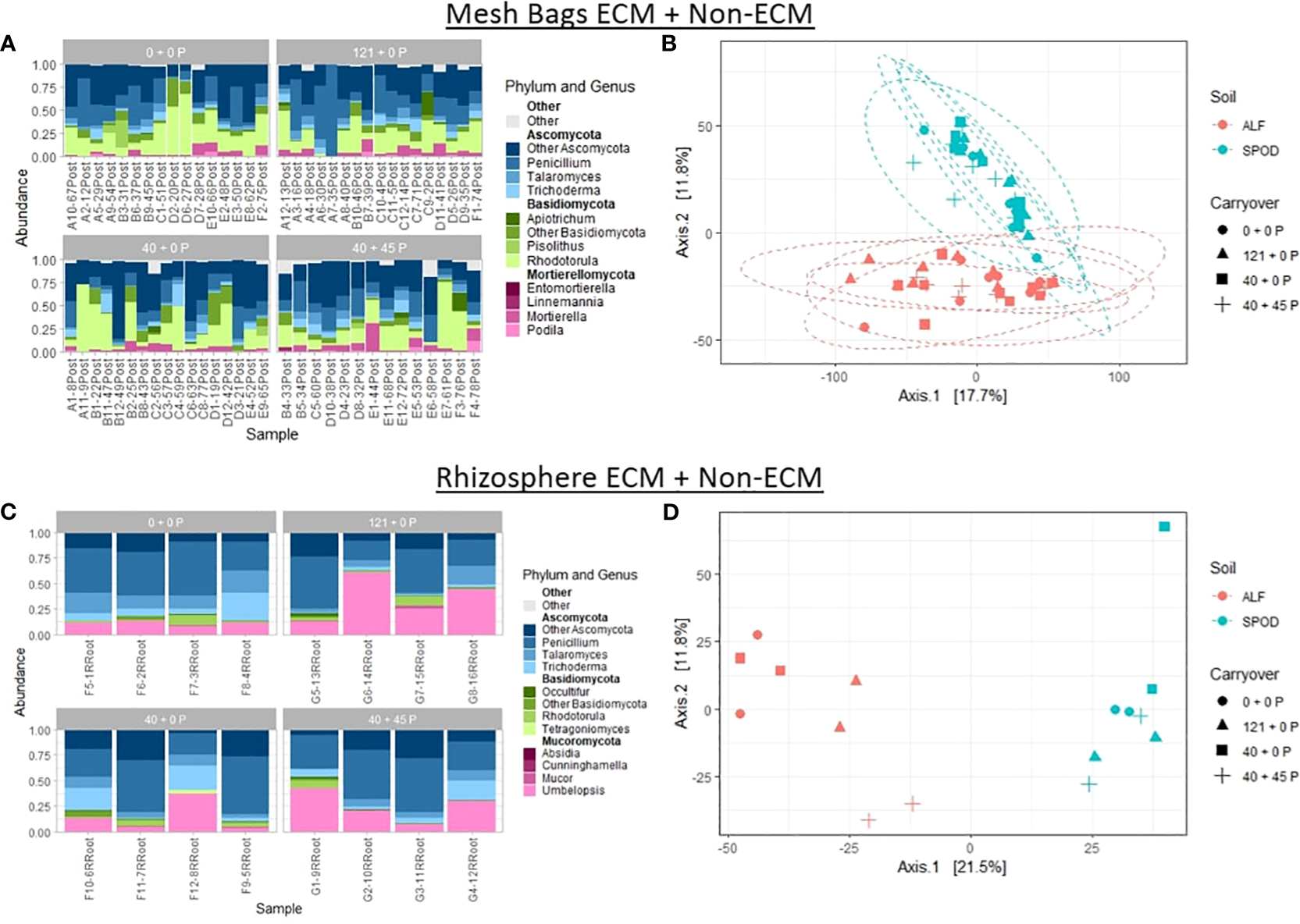 Figure 5 Relative abundance of fungal sequences illustrated using principal coordinate analyses (PCoA) graphs of mesh bags and rhizosphere ECM-only data. Principal coordinate analyses were constructed using DESeq2 normalized data projected using Bray-Curtis differences. Ellipses were constructed using a 95% standard deviation around carryover treatments. (B) Mesh bag PCoA of differences between P carryover treatments and site. (C) Rhizosphere relative abundances of top three most abundant phyla and genera. (D) PCoA of differences between P carryover treatments and site.