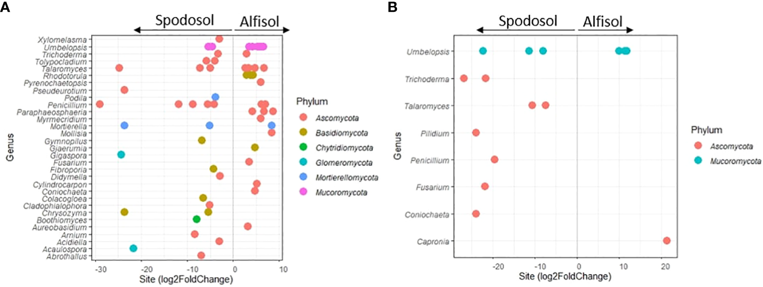 Figure 7 (A) non-ECM mesh bags and (B) non-ECM rhizosphere. Differential abundance of sequences by sites. Any dot indicates a significant log2FoldChange in genus level abundance (adjusted p-value < 0.05). log2FoldChange indicates the fold change in the number of counts found in that site, i.e., a log2fold change of positive two means there was a 4-fold increase in the number of sequences for those taxa for the Alfisol. Genera sequence abundances were normalized via DESeq2. The log2foldchange indicates the difference in fungal sequence abundance in sites.