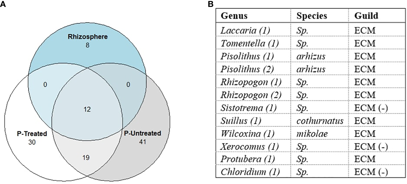 Figure 9 (A) Potential common core of raw ECM dataset sample counts show the 110 taxa classified as Ectomycorrhiza distribution between P-treated, P-untreated, and rhizosphere samples. Only 12 sequences were found in the rhizosphere and mesh bags, some of which were assigned the same taxa (1,2). (B) Rhizosphere and mesh bag shared taxa. Twelve taxa were found to be shared between the rhizosphere and the mesh bags treated with P. Only three Amplicon Sequence Variant (ASVs) were classified to the species level. Samples marked with (-) are possible ECM species but are not known as early colonizers of P. taeda.