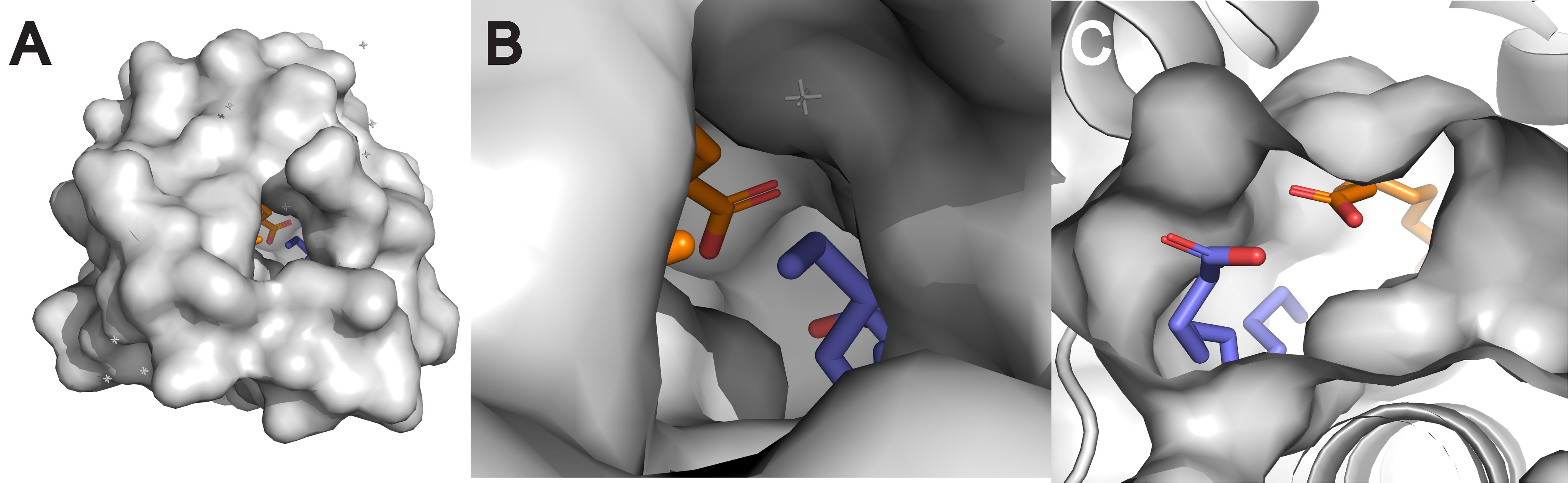 Figure 2. Surface structures of nsLTP from eggplant (Solanum melongena) (PDB ID: 7W9A) (Madni et al., 2023) visualized with PyMOL 3.1. The visualizations show the overall surface of the protein (A), a magnified view into its hydrophobic cavity (B), and a cross-section revealing two distinct lauric acid molecules sequestered within (C). This ability to bind multiple lipids at once is a key demonstration of the structural plasticity that underlies the “non-specific” binding nature of nsLTPs.