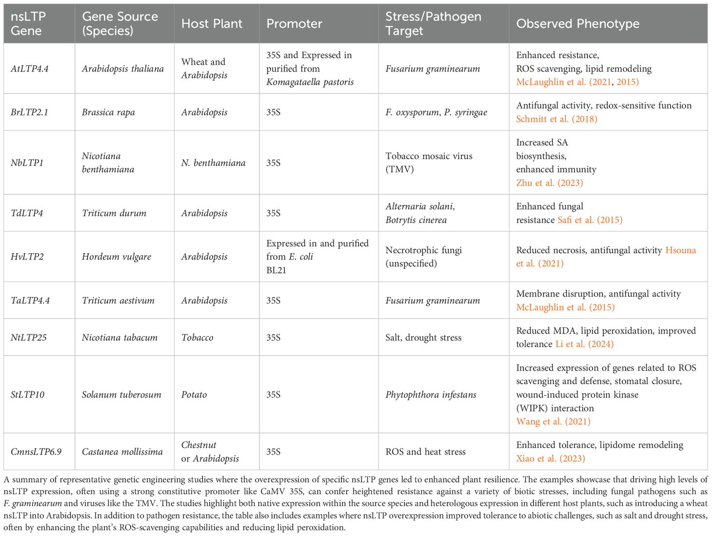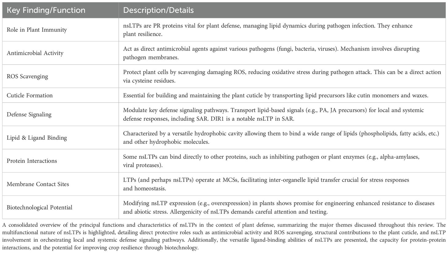 Plant resistance to pathogens relies on a multi-layered defense strategy that includes physical barriers, direct antimicrobial action, and sophisticated stress response mechanisms. nsLTPs and, more broadly, LTPs, play significant and interconnected roles in all these aspects of plant immunity (García-Olmedo et al., 1995; Gao et al., 2022; Carella et al., 2017).