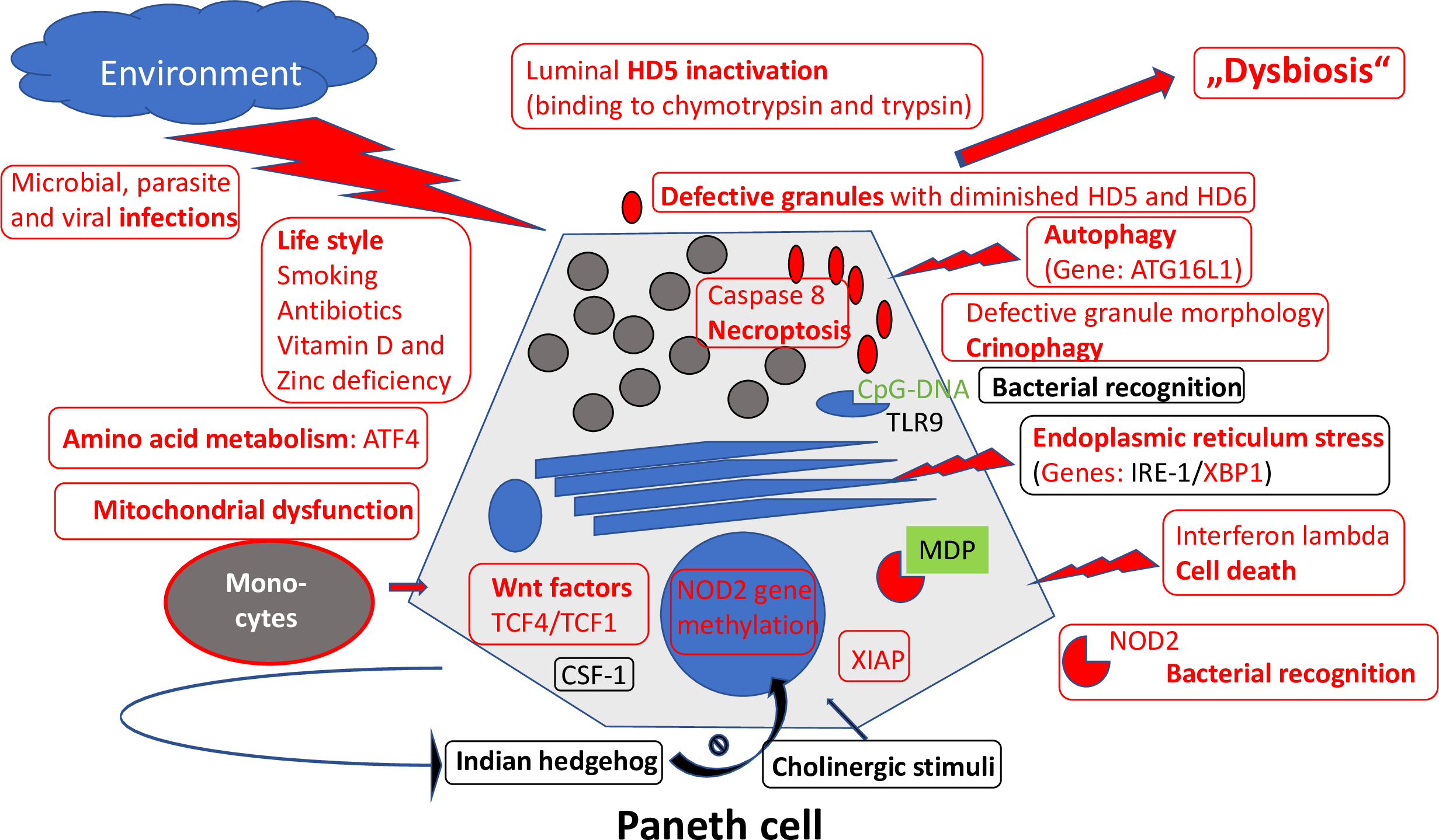 Overview of mechanisms regulating Paneth cell function and morphology. Those defective in ileal CD are labeled in red. Adapted from Wehkamp and Stange (44).