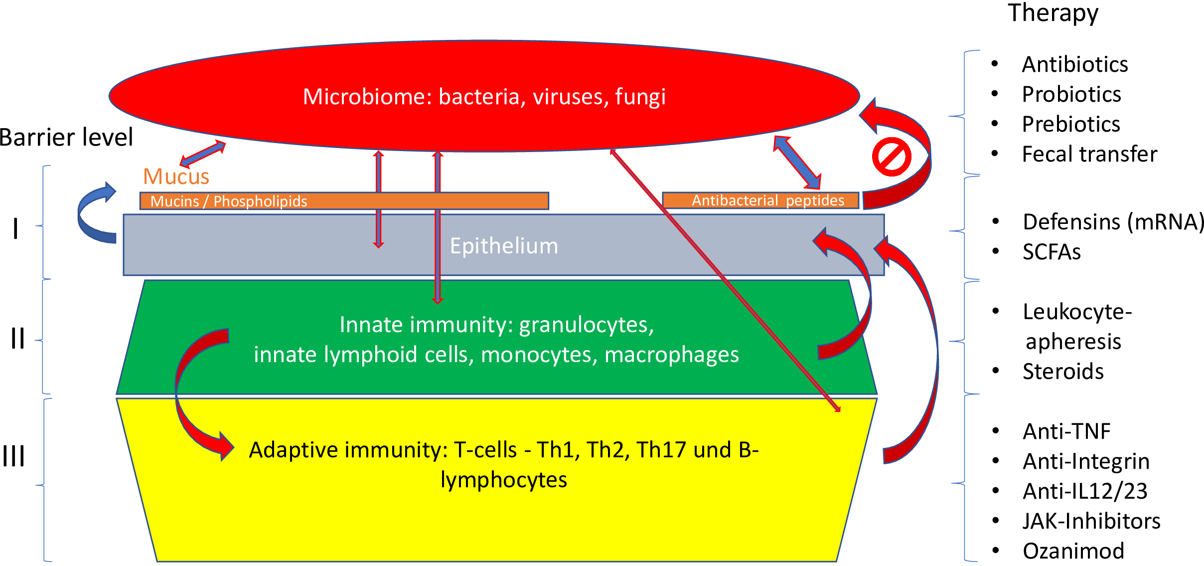 Taken together, there is a definite benefit from the use of monoclonal antibodies or the newer oral drugs in those patients who are refractory to the standard therapy or in certain clinical situations (extraintestinal manifestations or fistulae). However, initial lack or later loss of response remain a frequent problem and often require switches until all options have failed with surgery to follow. Therefore, even the most enthusiastic proponents of biologicals accept that there is a therapeutic ceiling that limits treatment success (2). Biologicals and probably also the newer oral drugs have significantly broadened the therapeutic armamentarium in IBD but have failed to achieve permanent remission in most patients and, sadly, also cannot prevent disease progression: there is no cure in sight. Several new JAK-inhibitors and novel antibodies will probably be marketed soon, including anti-IL23, but, as stated above, probably will not revolutionize the field (4, 5). This should motivate us to rethink the therapeutic approach focusing on the novel pathogenetic concepts derived from extensive genetic and microbiological studies and, above all, understanding IBD as a barrier disease (7).
