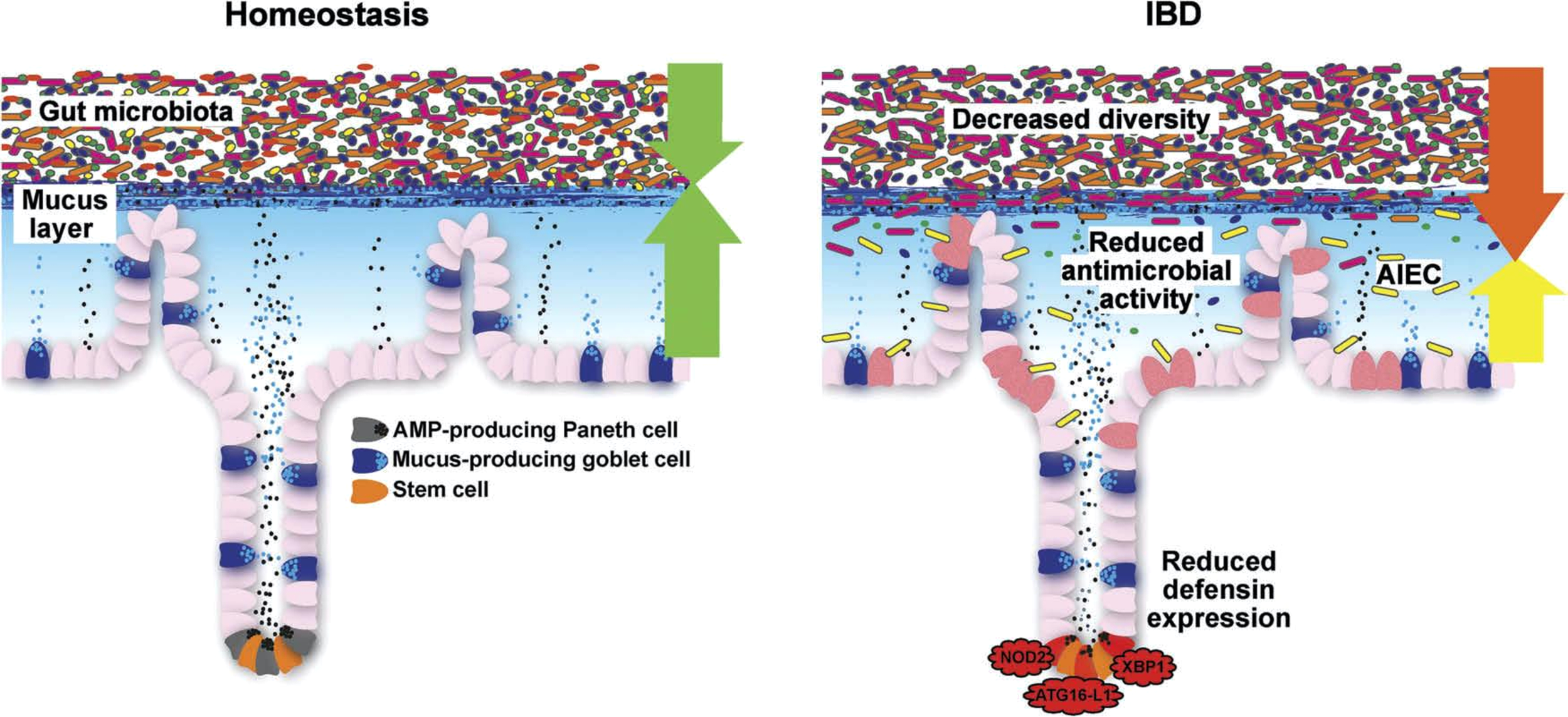 Finally, there is a Mendelian IBD: the X-linked inhibitor of apoptosis (XIAP) deficiency, also known as the X-linked lymphoproliferative syndrome type 2 (XLP-2), a rare primary immunodeficiency. XIAP deficiency is characterized by a key triad of high susceptibility to develop hemophagocytic lymphohistiocytosis frequently triggered by Epstein–Barr virus infection, recurrent splenomegaly, and IBD with the features of Crohn’s disease. Very recently, it was demonstrated that the loss of XIAP rendered Paneth cells sensitive to microbiota-, TNF-, receptor-interacting protein kinase 1 (RIPK1)-, and RIPK3-dependent cell death. This is associated with deficiency in Paneth cell–derived antimicrobial peptides and alterations in the stratification and composition of the microbiota (52).
