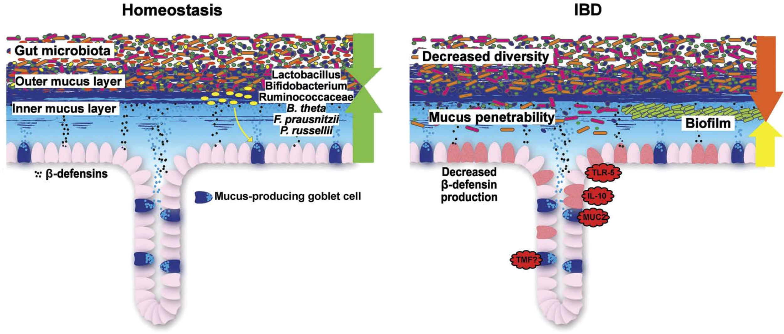 In addition to being confronted with nearby commensals in UC, the goblet cell is also exposed to a complex and delicate cytokine milieu: during active inflammation, key pro-inflammatory cytokines, such as TNF-α, interferon (IFN)-γ, and IL-13, have direct deleterious effects on epithelial barrier integrity (93). In conclusion, convincing evidence supports the role of mucus in protecting the mucosa during health and its dysfunction or even complete lack as a primary event permitting bacterial invasion. As inflammation in terms of cytokine milieu and bacterial influx is deleterious to goblet cells, this is likely a vicious cycle with tissue destruction as a result.