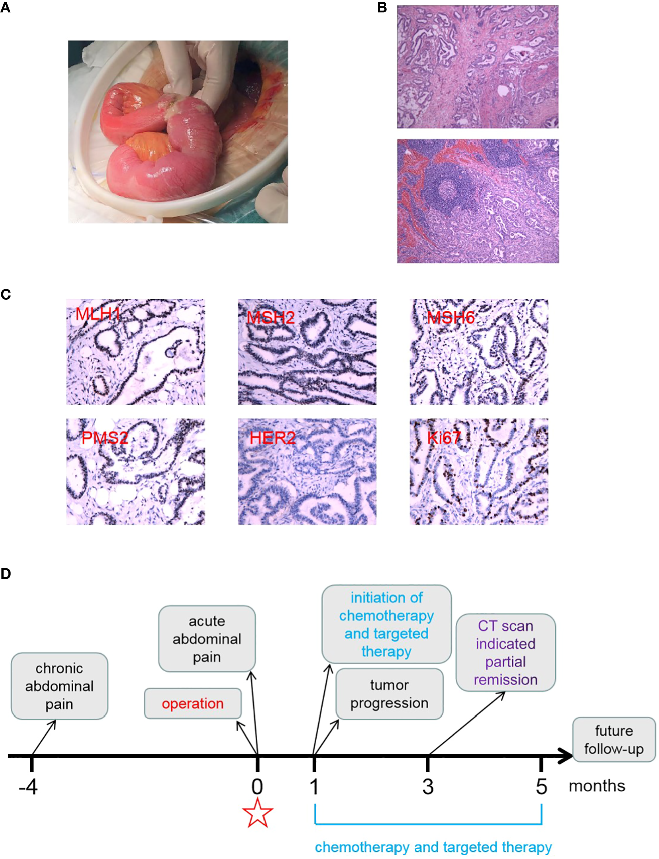 Postoperative pathologic examination of the patient’s tumor specimen and an illustrative timeline of our treatment and patient’s response. (A) A photo displaying the perforation of the tumor in the ileum during the operation. (B) Representative photos of the tumor specimen with hematoxylin and eosin staining, revealing moderately to poorly differentiated adenocarcinoma. (C) A representative photo of immunohistochemistry staining indicating positive expression for MLH1, MHS2, MSH6, PMS2, and Ki67, but negative expression for Her2. (D) An illustrative timeline showcasing our treatment approach and the patient’s response.