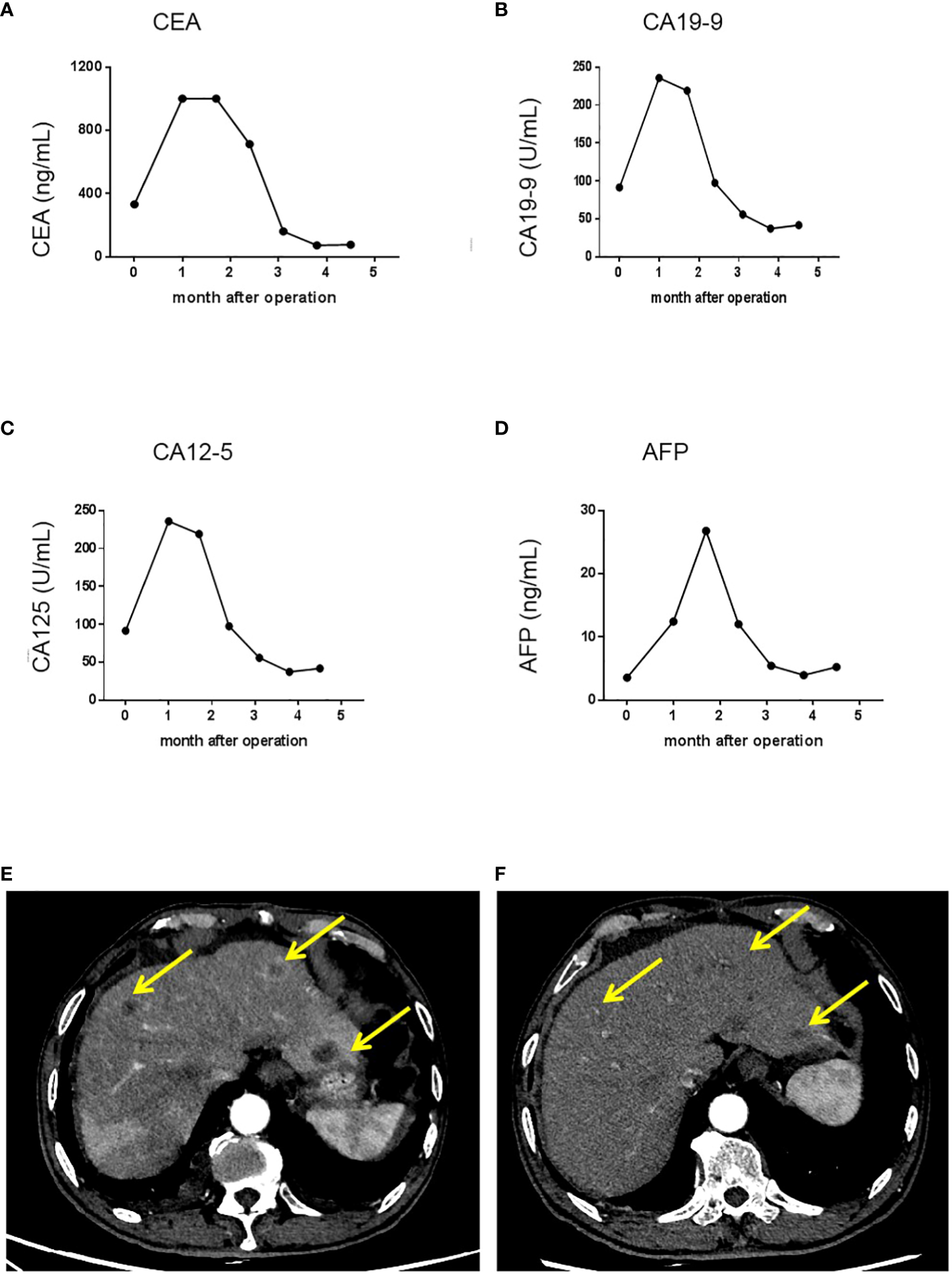 Trends in serum tumor marker levels and shrinkage of liver metastatic nodules after the initiation of chemotherapy and targeted therapy. (A) Serum CEA levels in each cycle of therapy; (B) Serum CA19-9 levels in each cycle of therapy; (C) Serum CA12-5 levels in each cycle of therapy; (D) Serum AFP levels in each cycle of therapy. (E) A representative image showing liver metastatic nodules found one month after the operation. (F) A representative image showing shrinkage of liver metastatic nodules. After initiation of chemotherapy and targeted therapy. CA 19-9, carbohydrate antigen 19-9; CEA, carcino-embryonic antigen; CA12-5, carbohydrate antigen 12-5; AFP, alpha fetoprotein.