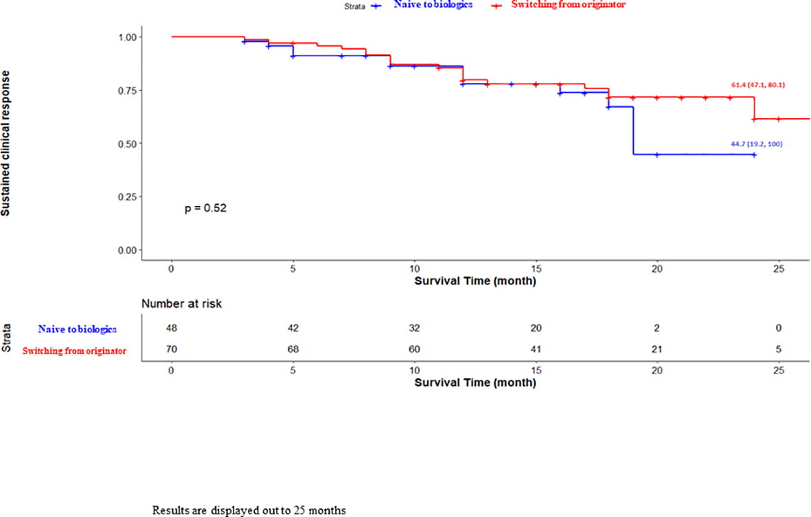 Figure 2 Unadjusted Kaplan-Meier survival curve for sustained clinical response based on naïve to biologics. Results are displayed out to 25 months.