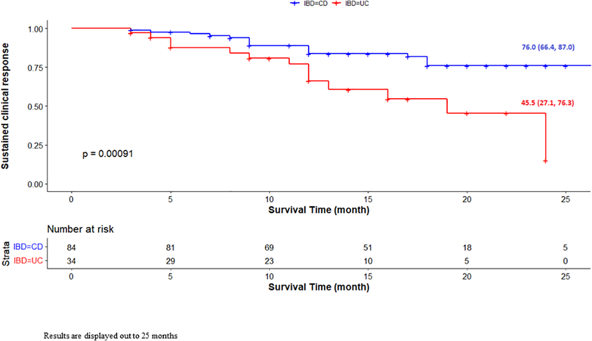 Figure 3 Unadjusted Kaplan-Meier survival curve for sustained clinical response based on IBD type. Results are displayed out to 25 months.