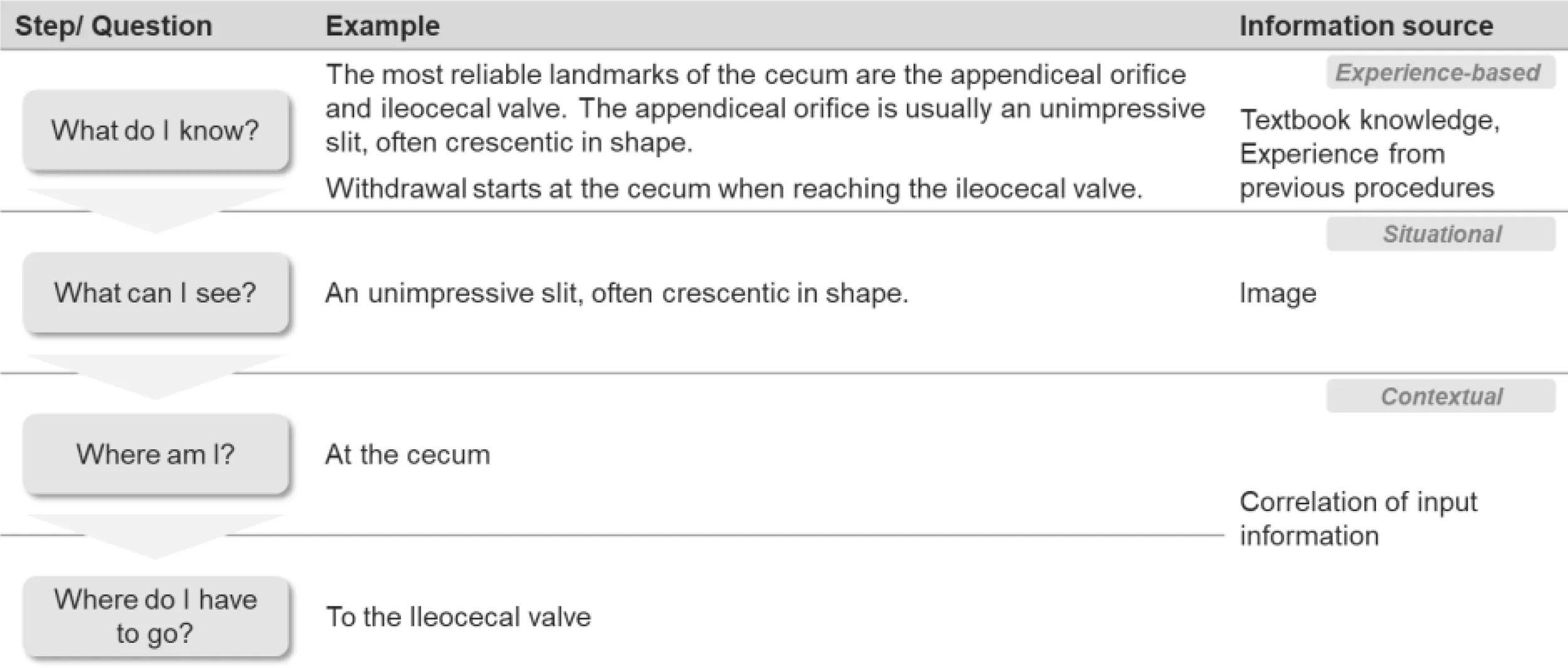 AR navigation support enriches the real-time image with experience-based, situational and contextual information that helps the user to navigate. AR solutions can support the user at different steps of the cognitive process of a navigating endoscopist or surgeon.
