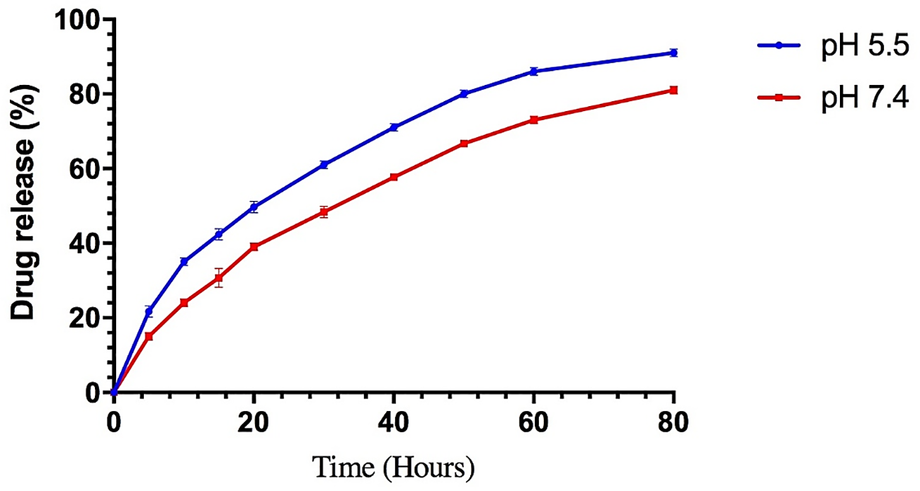 For 80 hours, 2ml of the BER-loaded liposome release profile was monitored in PBS (pH 7.4 and 5.5) at 37°C. As shown in Figure 4, the release rate of BER from the liposomes demonstrated an initial burst release and the total amount of BER released from the liposomes was 81% (at pH 7.4) and 91% (at pH 5.5). Nanocarriers have been developed to transport drugs that are unstable in the gastrointestinal tract, enhancing their bioavailability and pharmacological properties. Liposomes, the most common nanocarriers, are widely used for drug delivery. However, they have disadvantages such as limited stability, low solubility, and the potential for leakage and fusion of encapsulated drug molecules. These issues can be addressed through specific strategies (16, 17). One of the key components of gummy candy is gelatin. Gelatin is a polyampholyte, possessing both positive and negative charges, which makes it an amphiphilic molecule with hydrophilic and hydrophobic groups. This characteristic enables gelatin to interact with oppositely charged biopolymers and adsorb at the oil-water interface, making it a versatile encapsulating agent for producing various nanocarriers (26). The prepared liposomes released BER in an acidic medium slower than in a neutral medium. It is evident that due to the unilamellar structure, liposomes are disrupted faster by acid (27). Recent studies on the use of gelatin as a nanocarrier have shown that it performs well at a pH of 5-7. In gummy candies, gelatin allows BER-loaded liposome to withstand the acidic conditions of the stomach and interact with the cancer cell membrane. This facilitates the effective release of BER (28, 29).