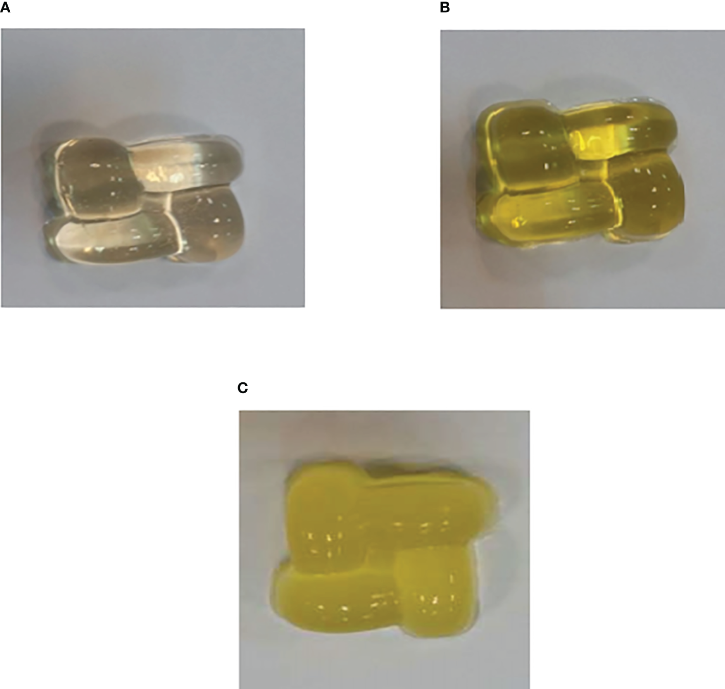 Figure 5. Gummy candies were produced for the study. (A) Only gummy candy, (B) Free BER in gummy candy, and (C) BER-loaded liposomes in gummy candy. 5 and 7.4 after 80 h.