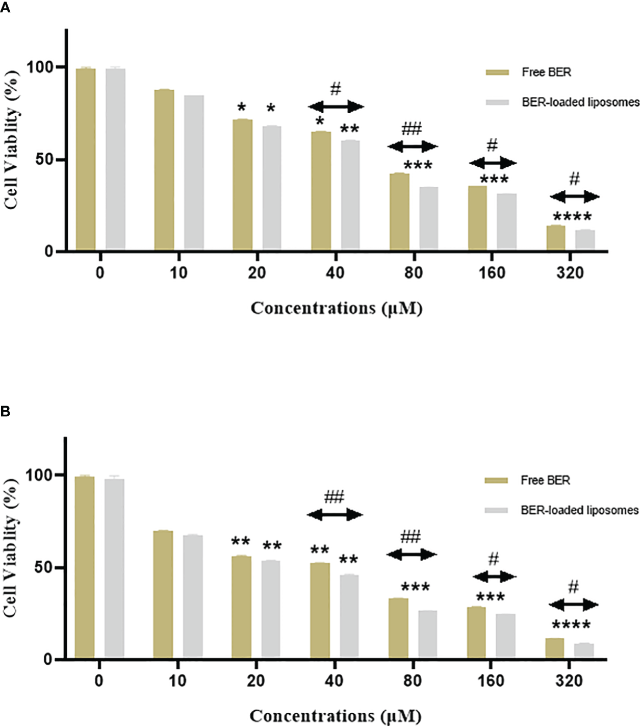 Figure 6. This chart compares the viability of the MKN-45 cells treated with free BER and BER-loaded liposomes after (A) 24 and (B) 48 hours. *P < 0.05, **P < 0.01, ***P < 0.001, and ****P < 0.0001. Indicate significant differences between the treatment groups and the control. #P < 0.05, and ##P < 0.01. Show the significant difference between free BER and BER-loaded liposomes.