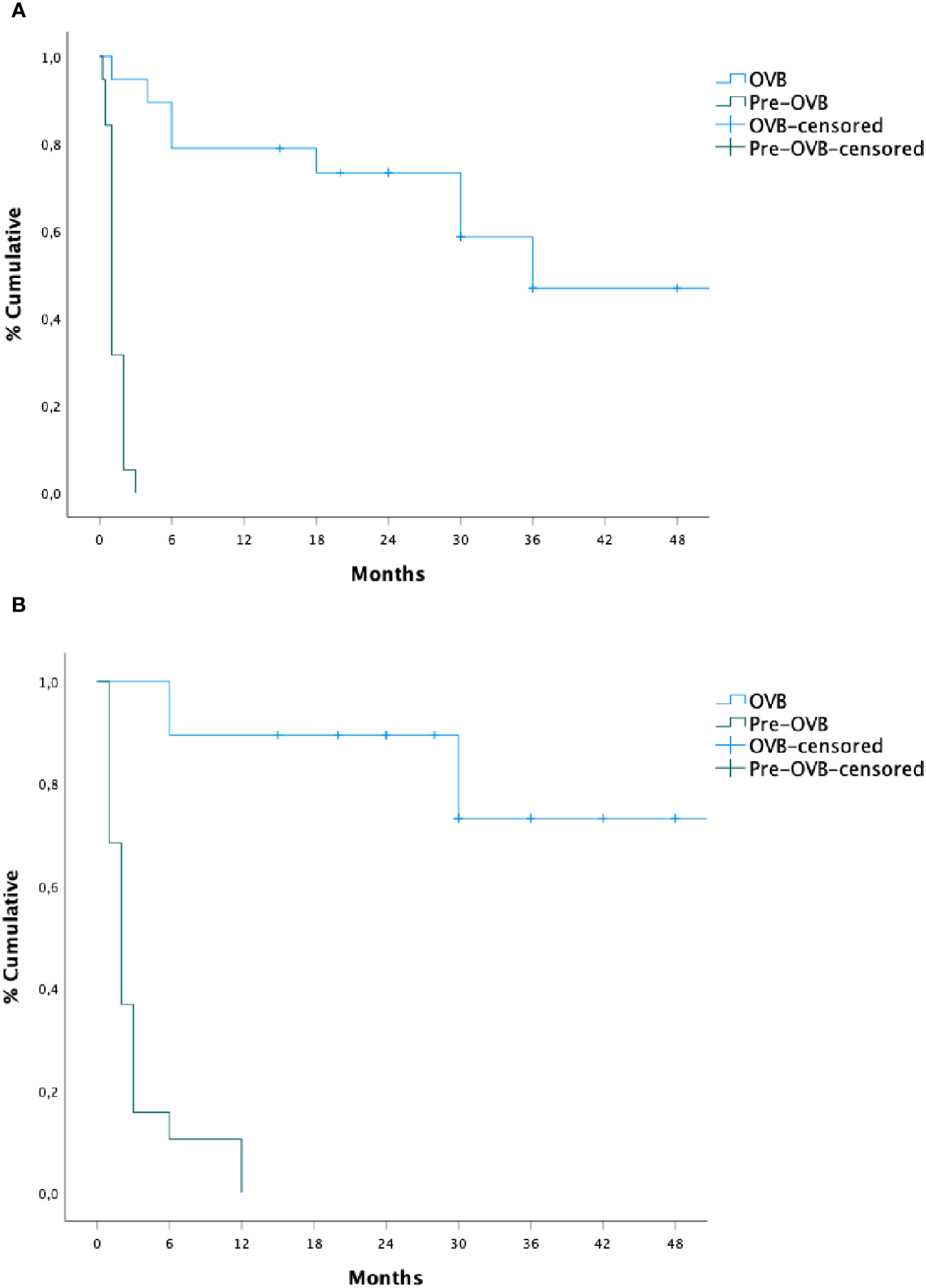 Data were expressed as median values and interquartile ranges (IQR) for continuous variables, while frequencies were used for categorical data as appropriate. The comparison of continuous variables employed either the student t test or the Mann-Whitney for nonparametric distributions. Nominal and independent variables based on sample size frequencies were analyzed using Chi square or Fisher exact tests; in cases where appropriate, the McNemar test was applied. For repeated observations with non-parametric distribution, Friedman analysis or Wilcoxon signed-rank test were conducted to evaluate differences between values. The time to recurrence of symptoms and dilations was analyzed using Kaplan-Meier methods, with differences between the curves evaluated using the log-rank test. Subsequently, regression analysis, employing Cox regression to determine influence and logistic regression to determine risk factors (including age, sex, prematurity, type of atresia, number of dilations before OVB, and duration of treatments) was conducted. Statistically significance was established if the null hypothesis could be rejected with greater than 95% confidence (p<0.05). All statistical analyses were performed using SPSS Statistics v. 27 (IBM Corp., Armonk, N.Y., USA).