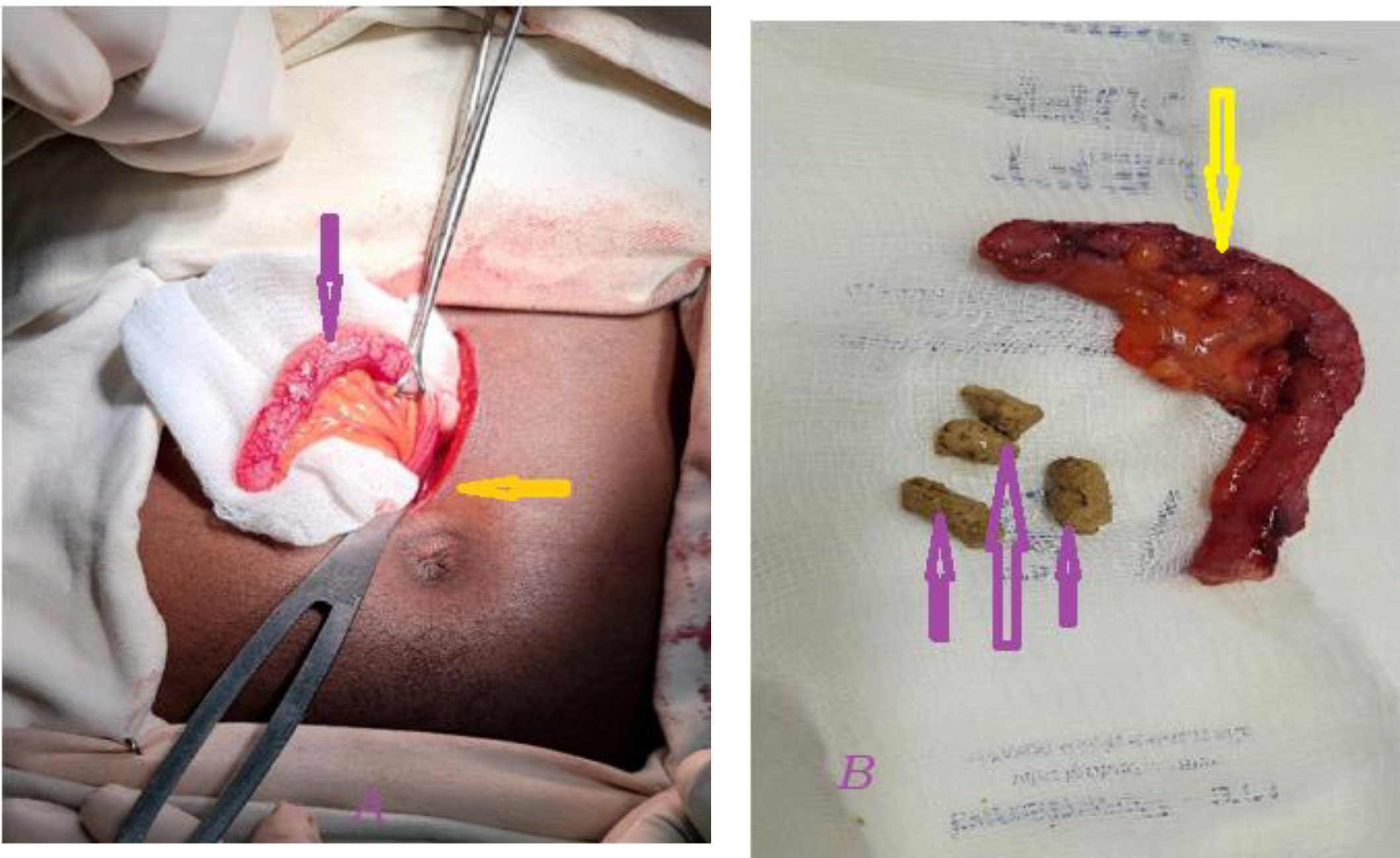 Figure 1. There was an enlarged and inflamed subhepatic appendix. (A) the yellow arrow shows the level of surgical incision at the level of the umbilicus while the pink arrow shows the removed appendiceal tissue with signs of inflammation. (B) An inflamed appendix measuring 6.55mm in diameter (yellow arrow) with an internal fecalith 1 cm in depth (pink arrow), suggestive of acute appendicitis.