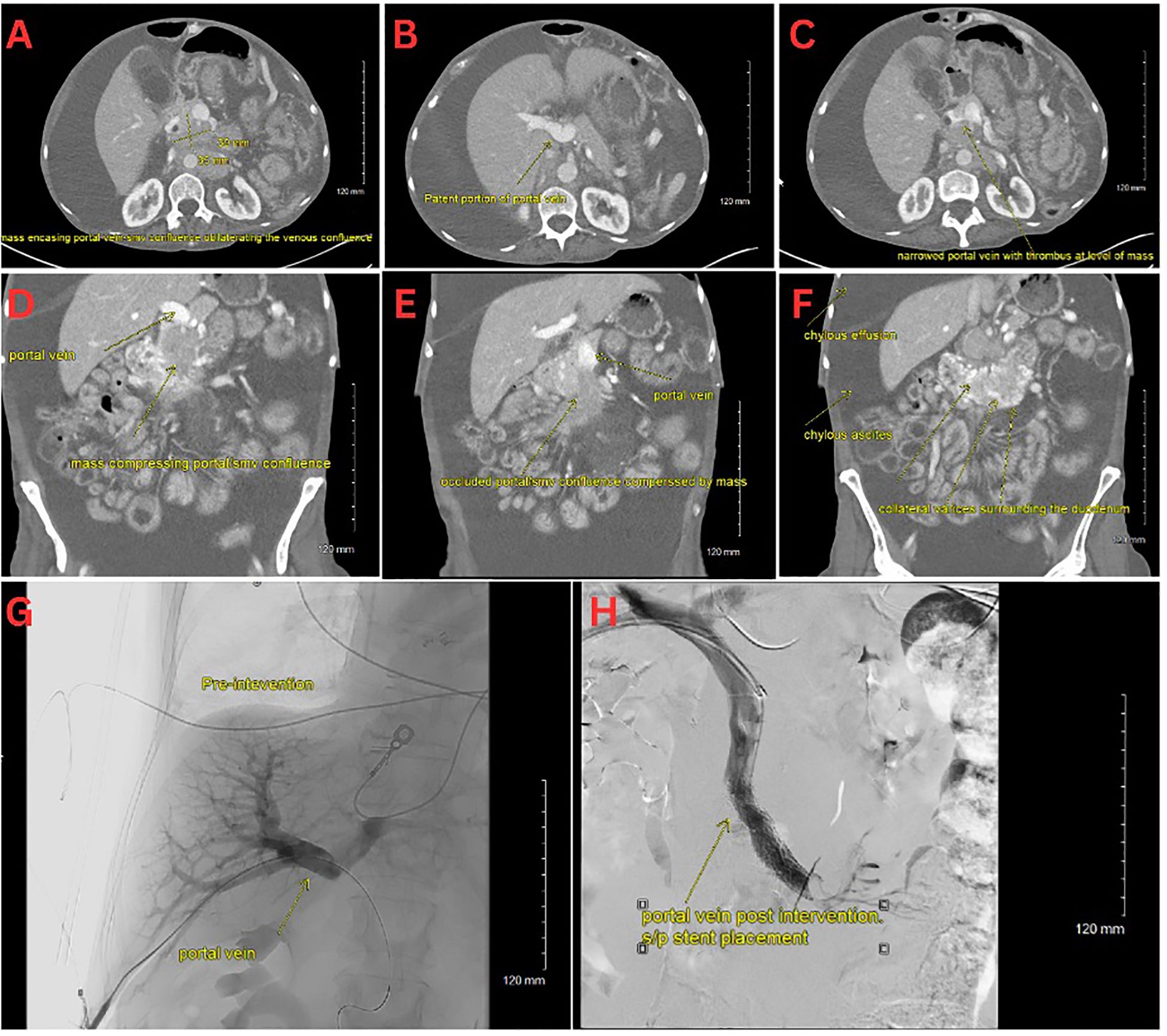 Figure 1. (A–C) CT scan with an axial view of the pNET mass. (D–F) CT scan with a coronal view of the pNET mass. (G) Venogram showing portal vein prior to stent deployment with no distal contrast visualized. (H) Venogram post SMV stent deployment with subsequent patency.