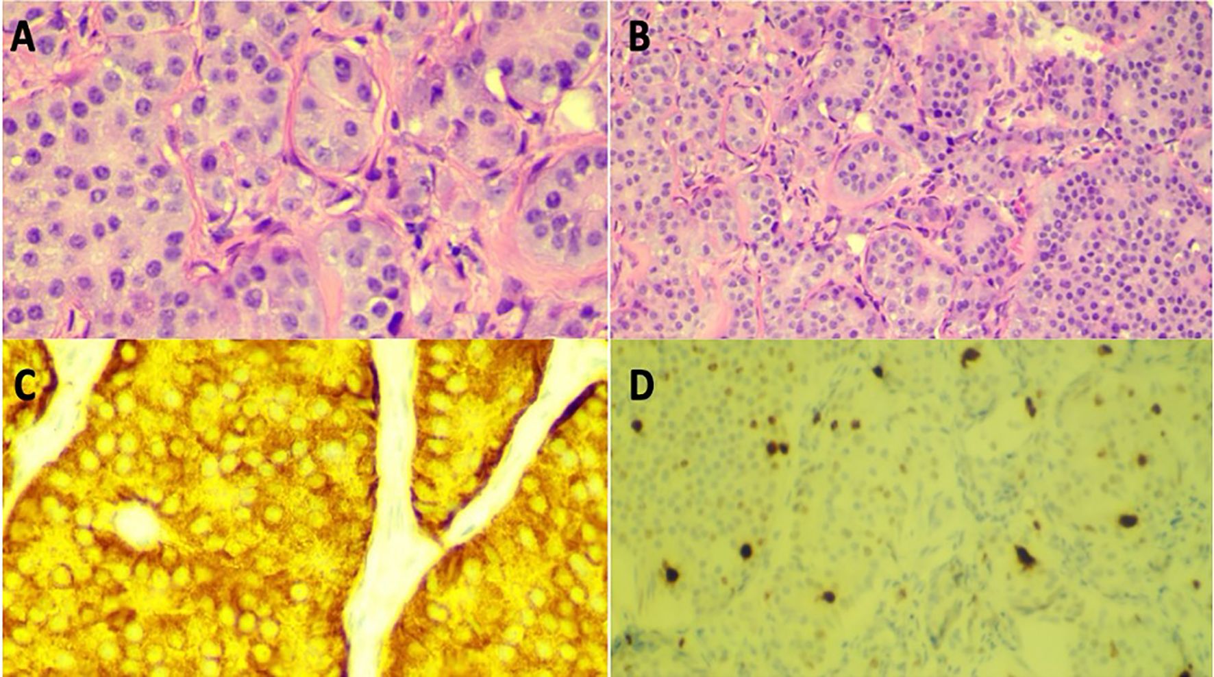 Figure 2. (A) High power (20x) view of H&E stain of retroperitoneal lymph node biopsy. (B) Low power (10x) view of H&E stain of retroperitoneal lymph node biopsy. (C) High power (20x) view Synaptophysin stain of lymph node biopsy in high power (20x) view. (D) Ki-67 positive stain (~4% positive), indicating well-differentiated grade 2 neuroendocrine tumor in low power (10x) view.