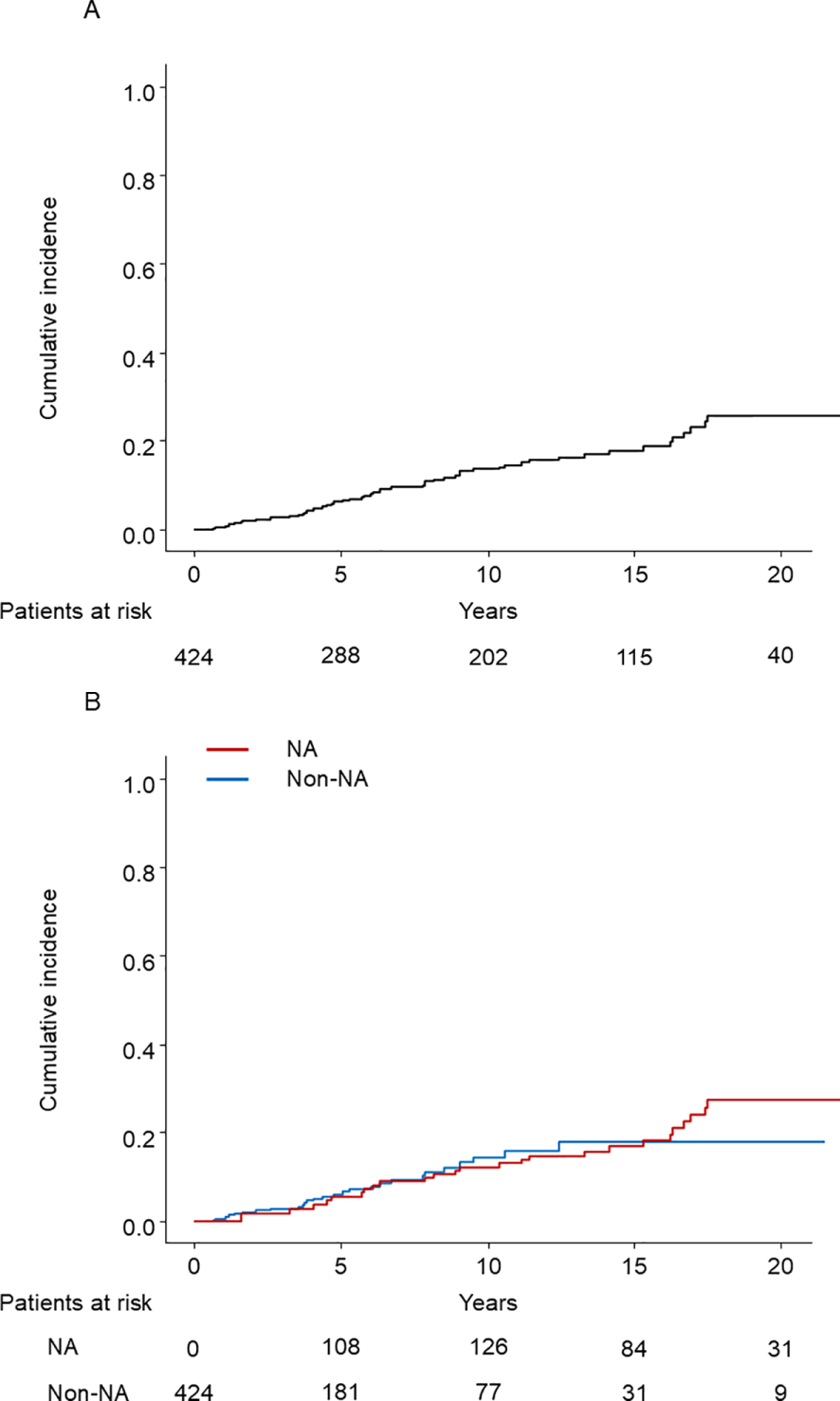 Among 53 patients who developed HCC, 21 (5 in the NA group and 16 in the non-NA group) died before the end of the observation period. The median survival time after HCC development was 16.5 years. The survival curves after HCC development according to the NA use at the diagnosis were shown in Supplementary Figure S4. The log-rank test showed no significant difference between the two groups (p = 0.3).